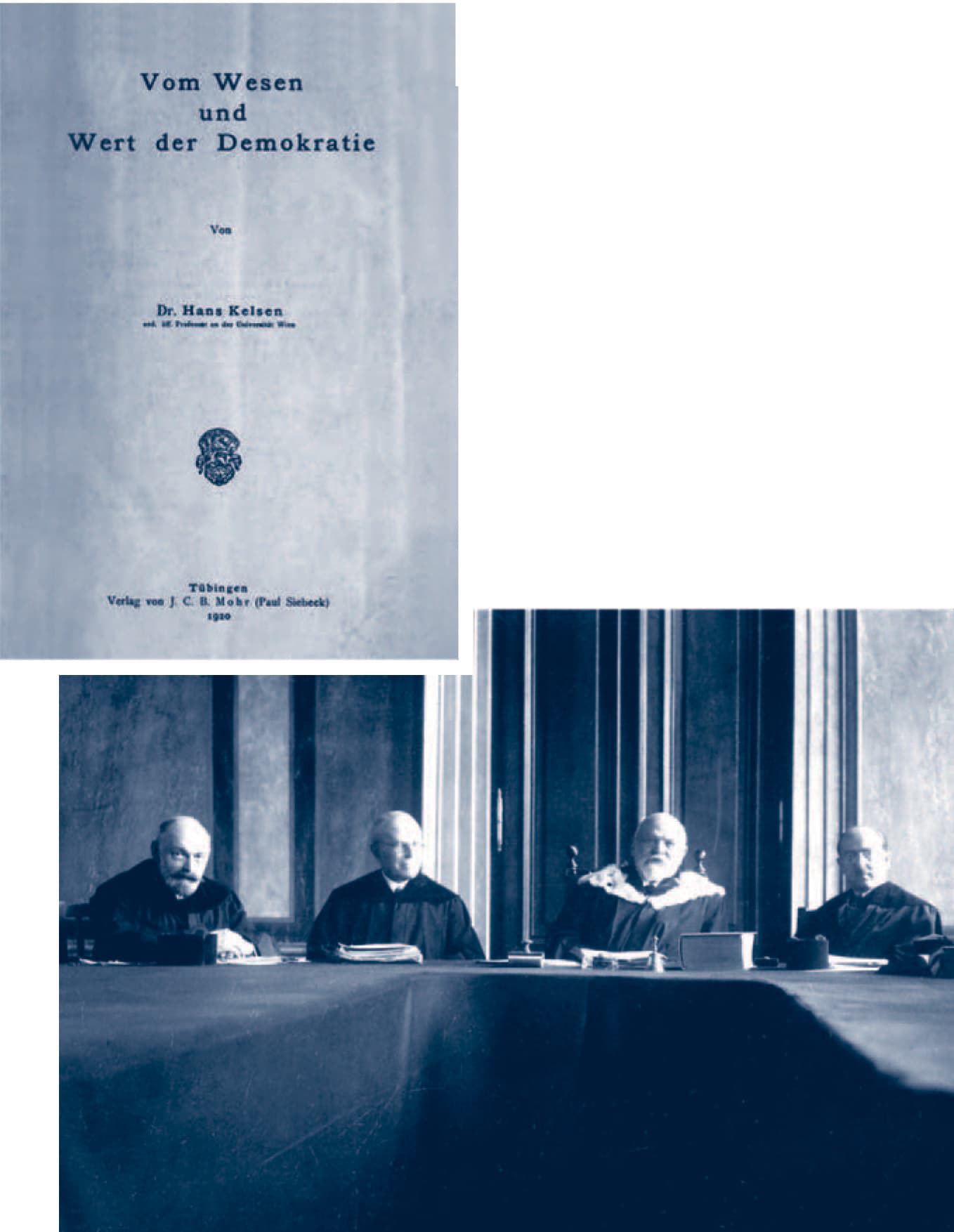 Фото вверху: «О сущности и ценности демократии», 1920 г. Фото внизу: Ганс Кельзен (2-й справа) на заседании Конституционного суда Австрии, около 1925 г.