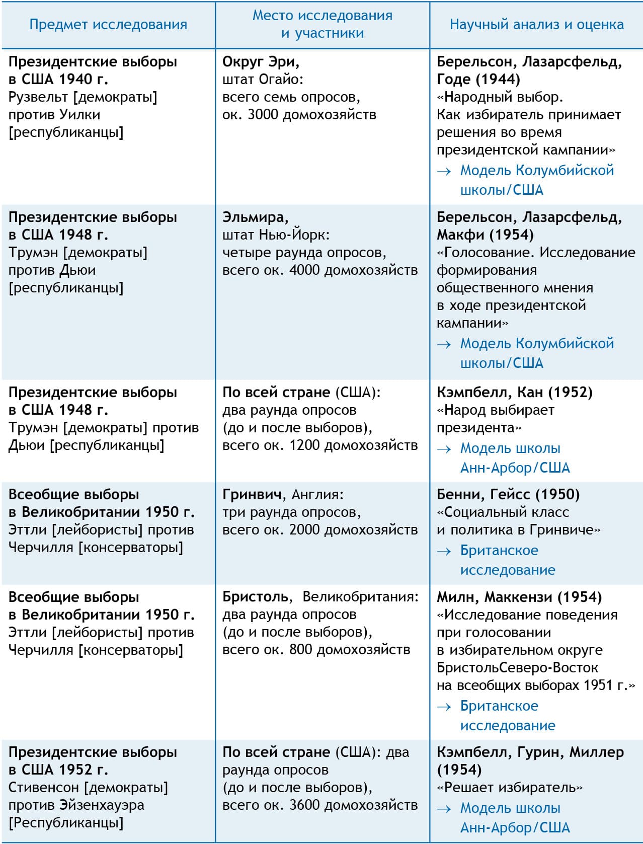 Рис. 40. Крупномасштабные социологические исследования поведения избирателей на выборах в США и Великобритании в период с 1940 по 1952 годы