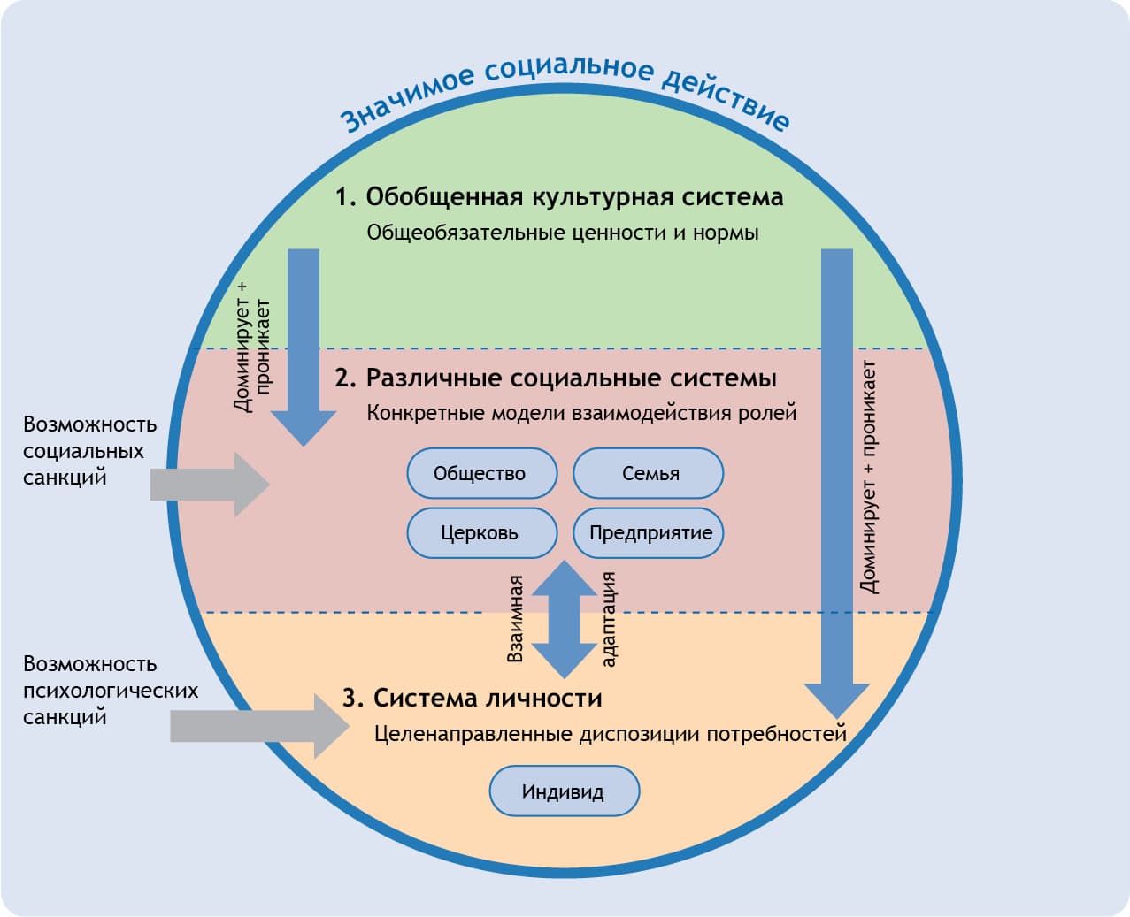 Различные социальные системы (в которых происходят институционализированные ролевые взаимодействия) в конечном счете всегда заимствуют свою конкретную организацию и легитимацию, а также нормативную рамку действий из генерализованных представлений о нормах и ценностях. При этом они одновременно находятся в постоянном процессе взаимоадаптации с существующими у индивидов личными потребностными диспозициями, которые, в свою очередь, тоже ориентированы на обобщенное содержание системы культуры. Поэтому социальные действия для Парсонса всегда представляют собой продукт взаимовлияния и интеграции следующих трех уровней: то, что от меня постоянно ожидается в общем случае (уровень 1: система культуры); альтернативы действий, имеющиеся у меня в моей конкретной роли (уровень 2: социальная система); мои собственные интересы и потребности (уровень 3: система личности).