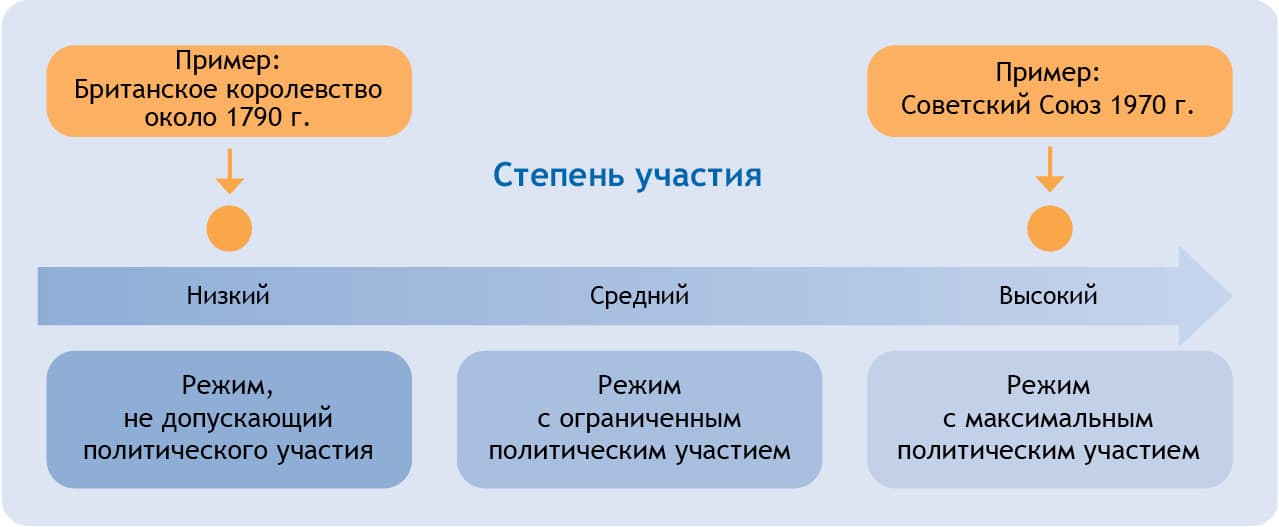 Второй теоретический аспект — измерение участия («включенности» / participation). Здесь измеряется масштаб и объем той части взрослого населения, которая действительно может пользоваться возможностями политического участия и (или) правами на оппозицию и конкуренцию, то есть активно организовываться в политические группы и участвовать в выборах. На соответствующей одномерной шкале постсталинский Советский Союз с его, по мнению Даля, в высшей степени инклюзивными политическими организациями и всеобщим активным и пассивным избирательным правом имел бы показатель, близкий к максимальному, а довикторианское Королевство Великобритания с его жестко ограниченным избирательным правом, допускавшим к электоральной процедуре лишь примерно 10 процентов граждан, оказалось бы на противоположном конце шкалы.