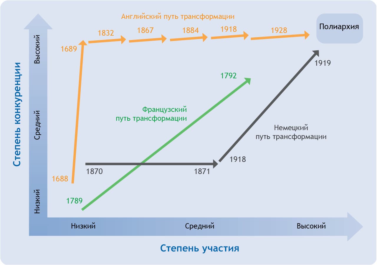 Если прочертить пути исторической трансформации, которые прошли современные национальные государства, на двухмерной плоскости, ограниченной осями участия и конкуренции, то легко заметить, что такие долговечные полиархии, как Великобритания, Швеция, США и Швейцария, совершали опасный критический переход от закрытой автократии к открытой полиархии в два этапа: вначале происходило расширение политической конкурентной борьбы и лишь затем, спустя десятилетия или века, осуществлялось вовлечение широких слоев населения. В то же время Первая Французская республика, попытавшись справиться с обеими задачами одновременно и всего за несколько лет (1789/1791–1794), потерпела неудачу. Та же судьба постигла и первый относительно продолжительный демократический эксперимент в Германии, где вскоре после основания второй Германской империи (1871) были сначала расширены исключительно возможности политического участия, а неограниченная политическая конкуренция установилась лишь почти пятьдесят лет спустя, в период Веймарской республики (1919).