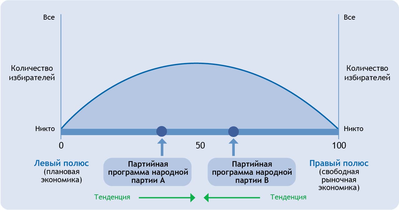 Идеологическая направленность и ориентация политических партий, нацеленных на максимизацию полученных голосов, зависит от того, где в указанном континууме находится большинство общества. Так, в демократических системах правления, в которых основная часть электората занимает позицию идеологического центра, царит максимум политической стабильности, поскольку и конкурирующие массовые партии в своих программах склоняются к центру, где они могут надеяться на наибольшую электоральную добычу и, соответственно, демонстрируют идеологическую расплывчатость и индифферентность. И только страх потерять при этом слишком много голосов на своем изначальном, правом или левом, фланге удерживает в итоге крупные партии, постоянно сдвигающиеся к центру, от того, чтобы стать содержательно идентичными друг другу.