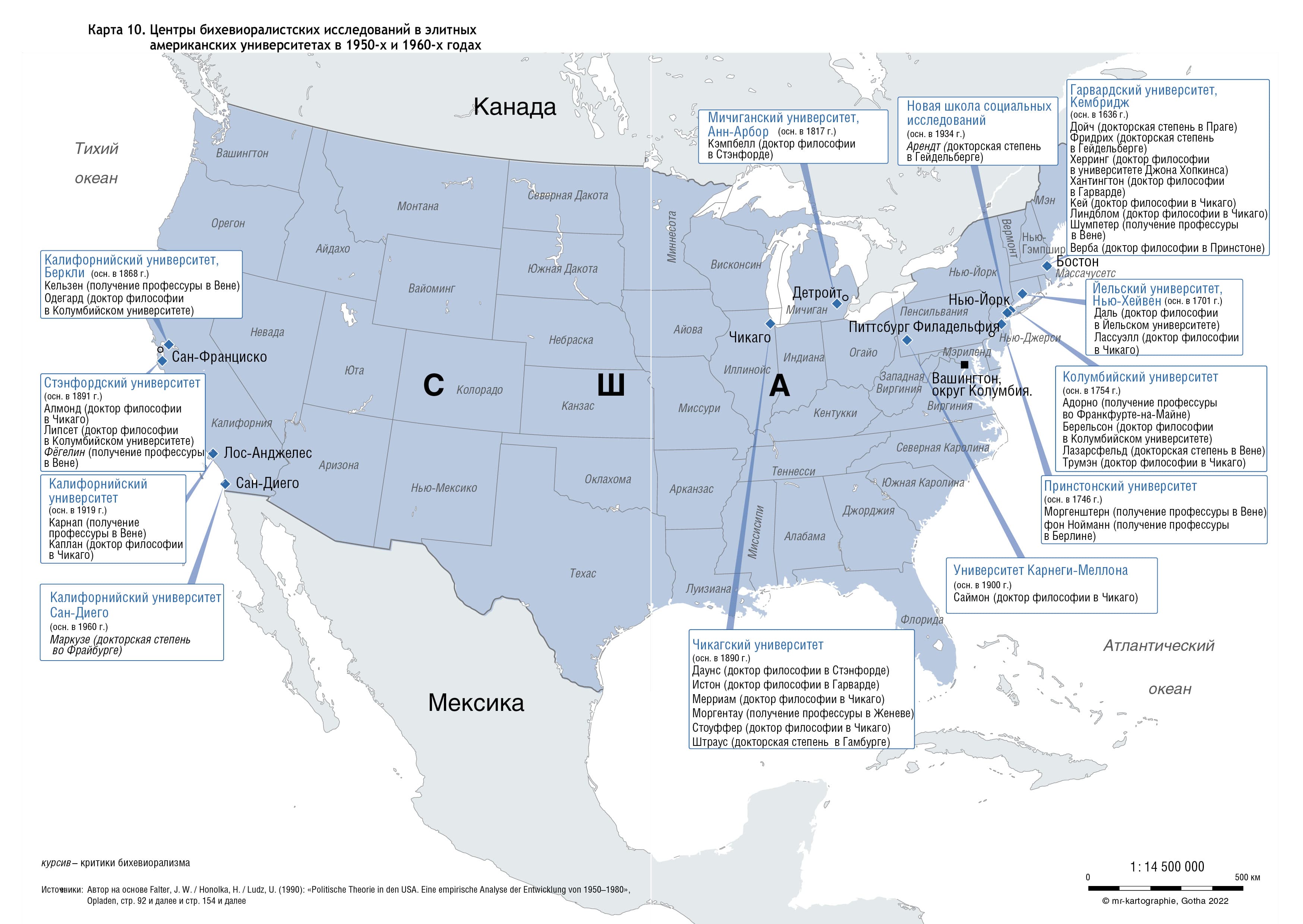 Карта 10. Центры бихевиоралистских исследований в элитных американских университетах в 1950-х и 1960-х годах
