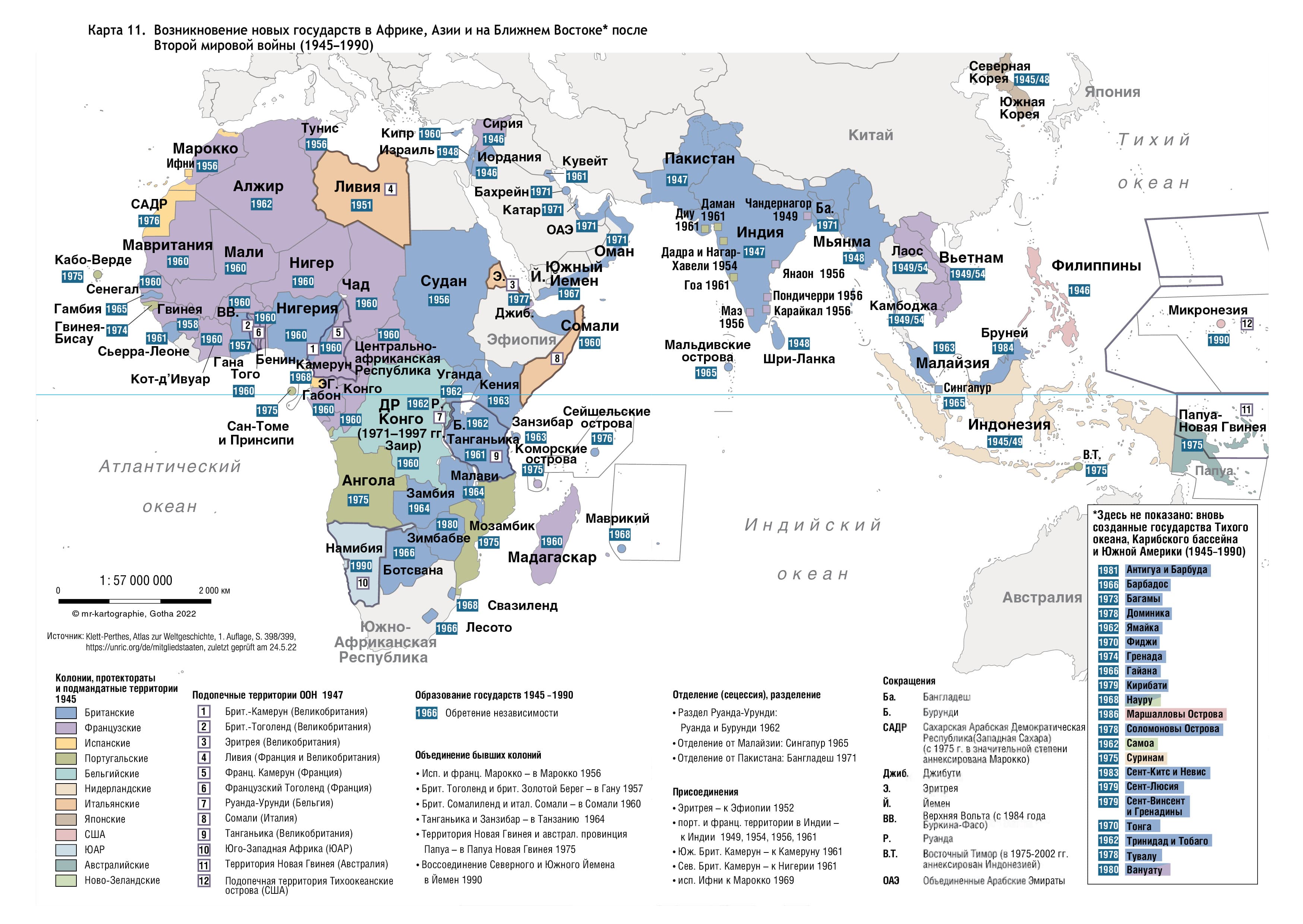 Карта 11. Возникновение новых государств в Африке, Азии и на Ближнем Востоке после Второй мировой войны (1945–1990)