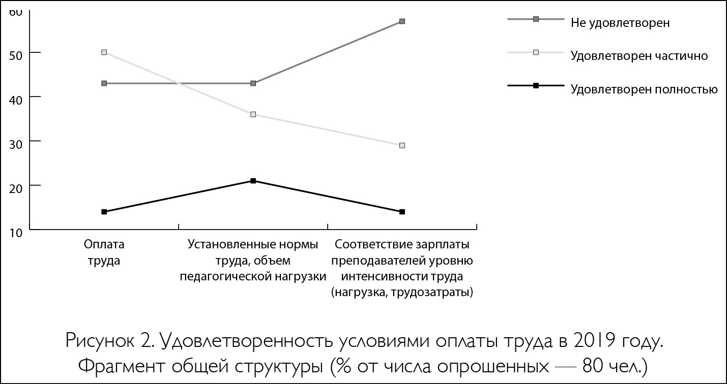 Надо сказать, что накануне ковидного кризиса сотрудники университета были своей работой скорее удовлетворены. В структуре кластера удовлетворенности трудом в этот период только по одной позиции ими было выставлено наибольшее число неудовлетворительных оценок — это «соответствие зарплаты преподавателей уровню интенсивности труда (нагрузка, трудозатраты)». Таким соотношением удовлетворены полностью только 14% опрошенных, еще 29% удовлетворены частично, а 57% опрошенных ими полностью не удовлетворены (табл. 6 и рис. 2).