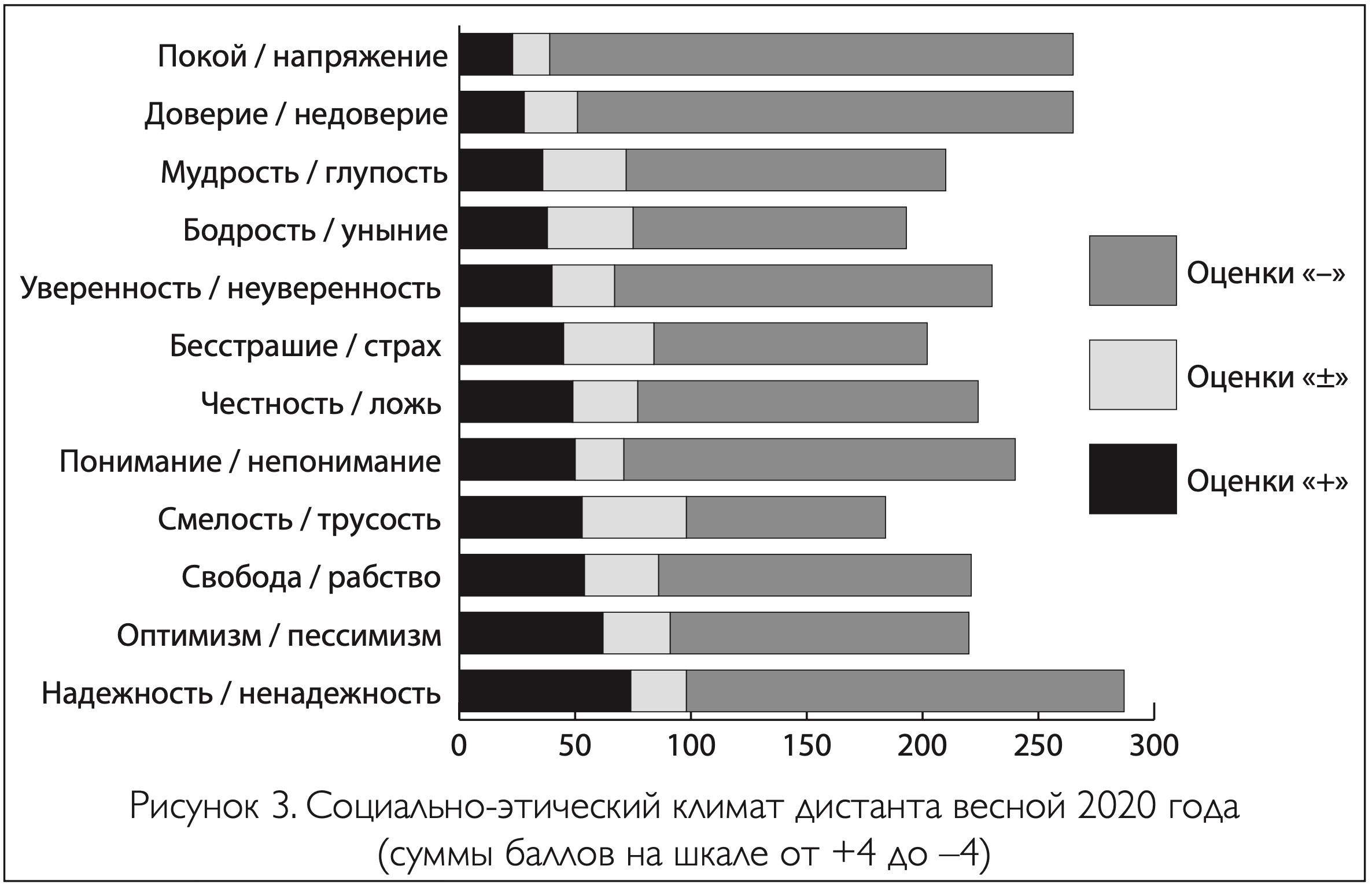 Табличные данные в упрощенном виде, с укрупненными интервалами, см. на рис. 3. В соответствии с суммой баллов по позициям «1–3» — «4» — «5–7» в нем выделены зоны позитивных, негативных и смешанных ощущений.