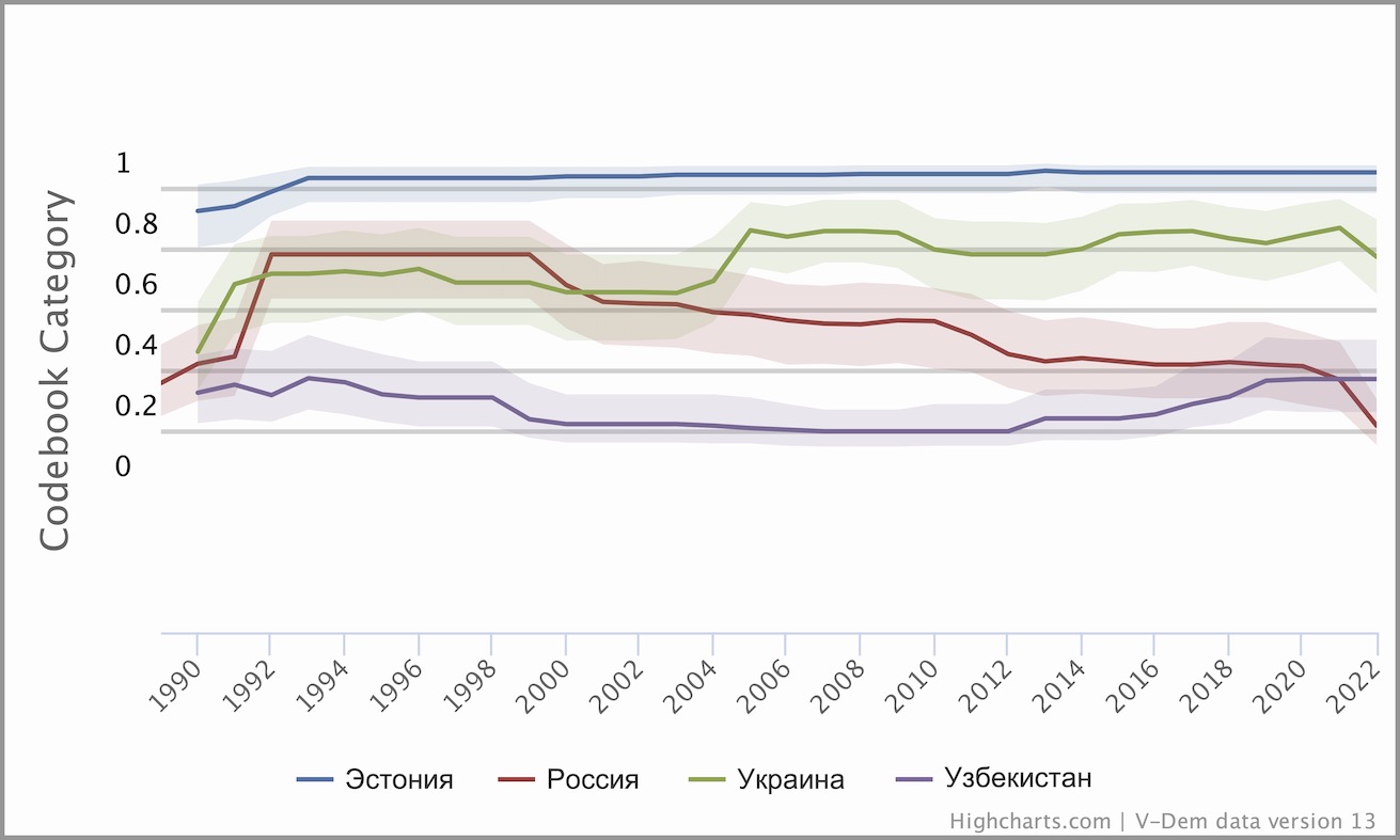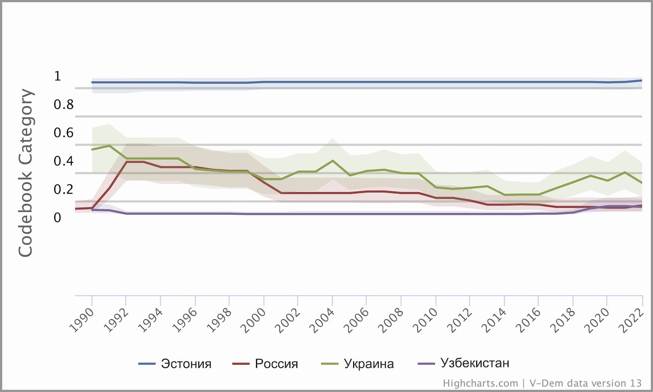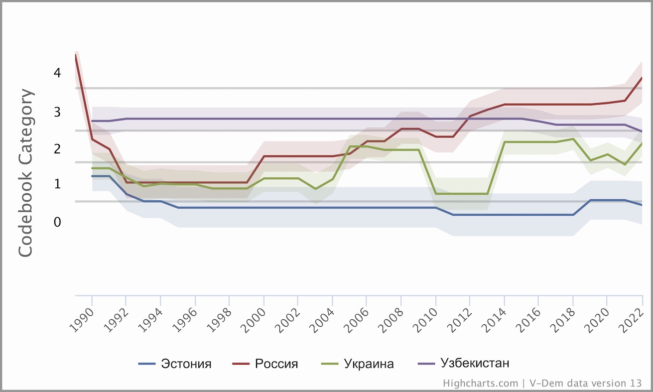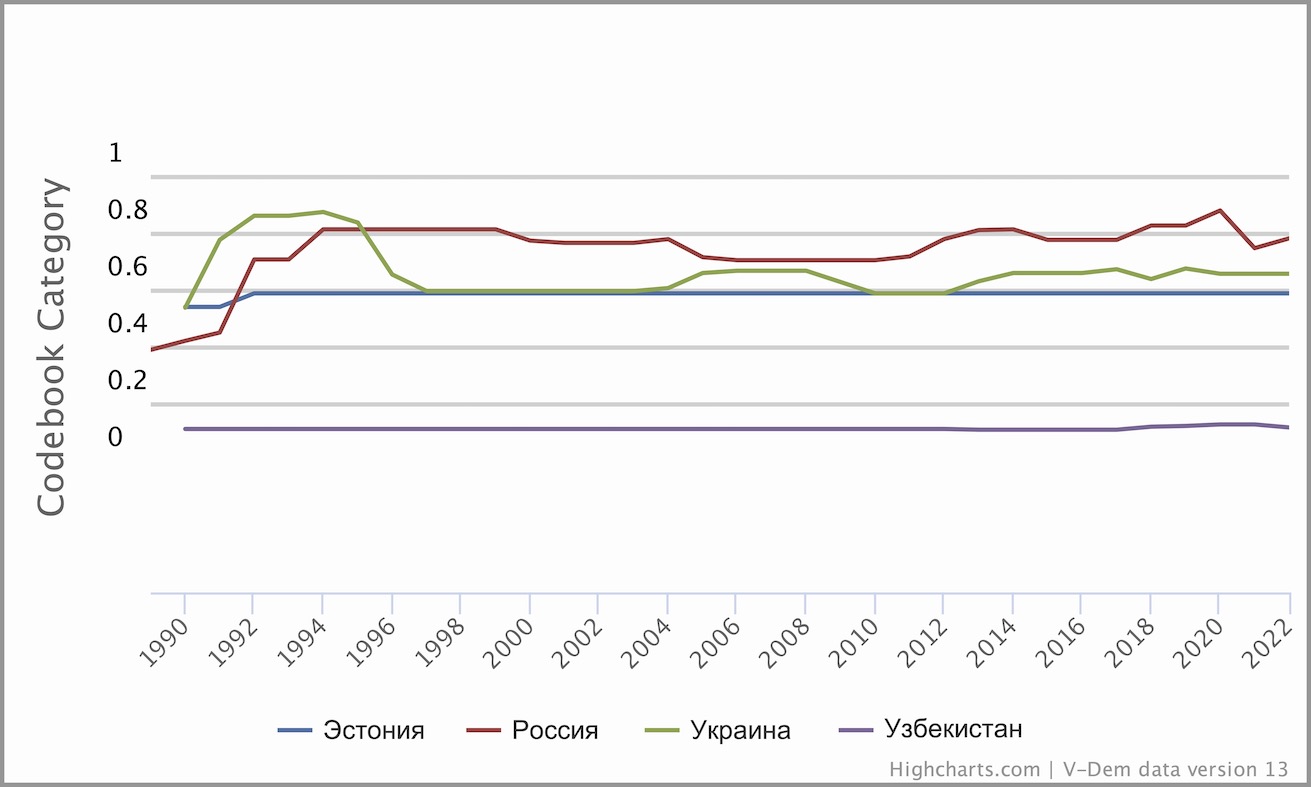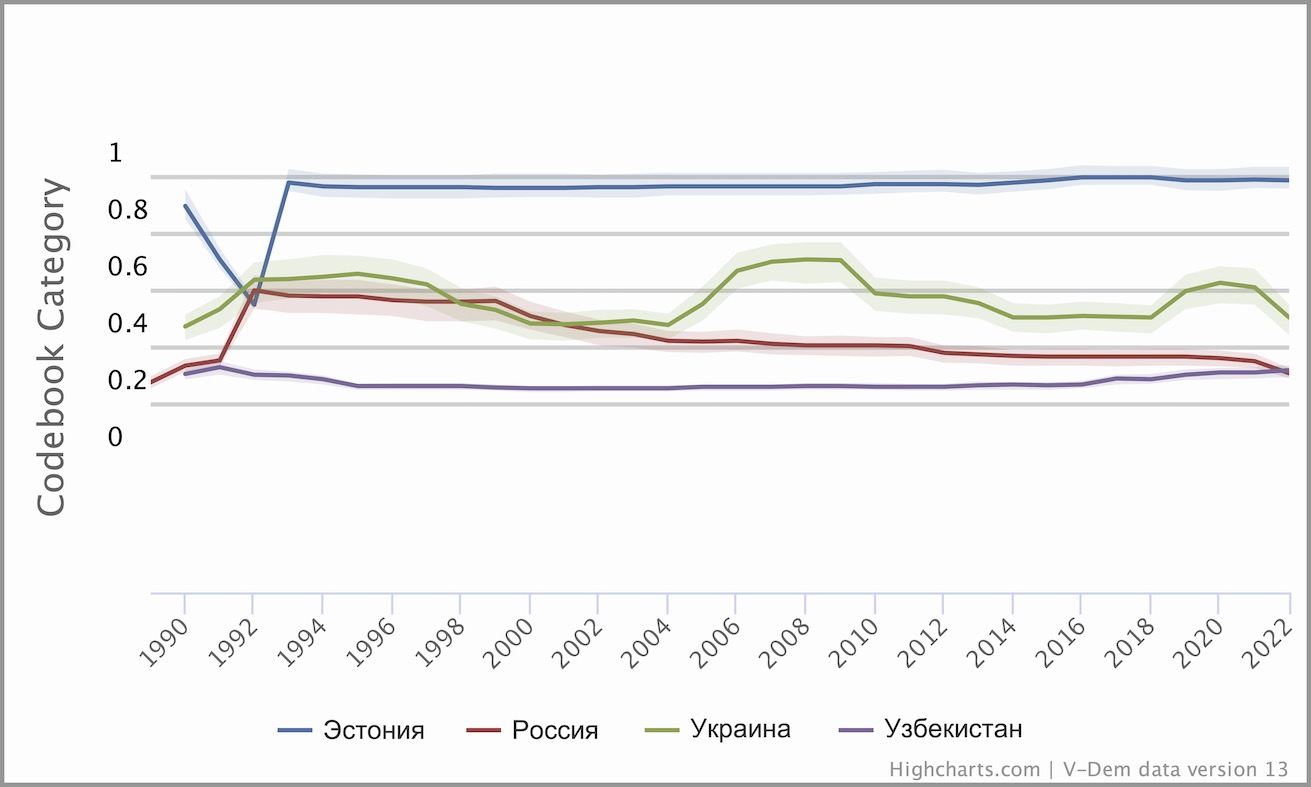 Тут и далее в этом разделе измерения индексов и других показателей взяты из базы данных V-Dem. В большинстве случаев сравнение постсоветских процессов ведется по четырем страновым кейсам* — Эстонии, России, Украине и Узбекистану. Эстонский пример — парламентская республика со стабильно высокими показателями демократического развития, при сильном влиянии институтов Совета Европы, ЕС и НАТО. Россия — пример президентской республики, пережившей период демократизации, но затем упадок демократии перерос в период глубокой автократизации, при некотором влиянии институтов Совета Европы. Украина — пример смешанной республики с несколькими переходами от роста к упадку демократии и от роста к упадку автократии, при некотором влиянии институтов Совета Европы и ЕС. И, наконец, Узбекистан — пример президентской республики с долгой автократизацией после очень недолгого периода демократизации, с минимальным влиянием извне на политические структуры страны. ↩︎