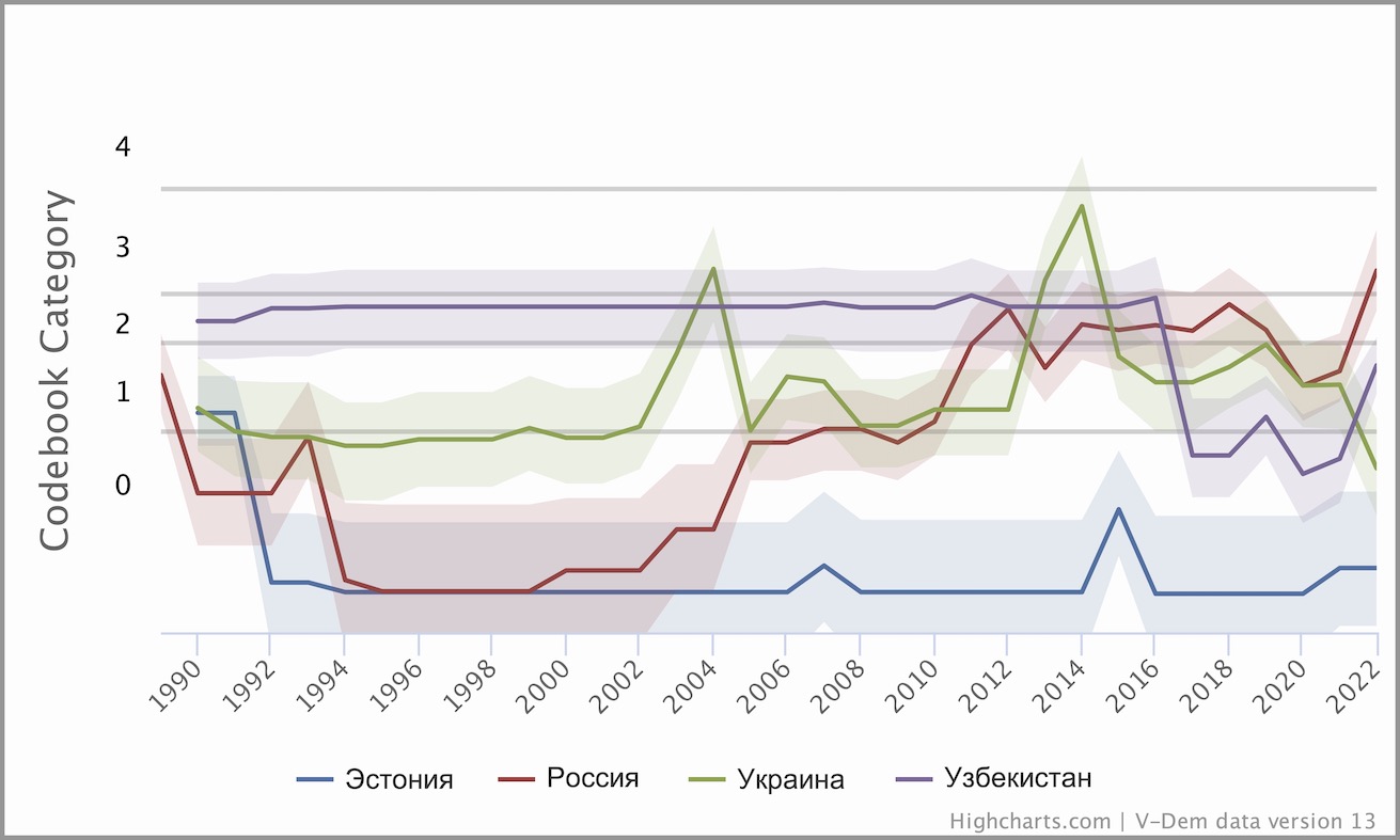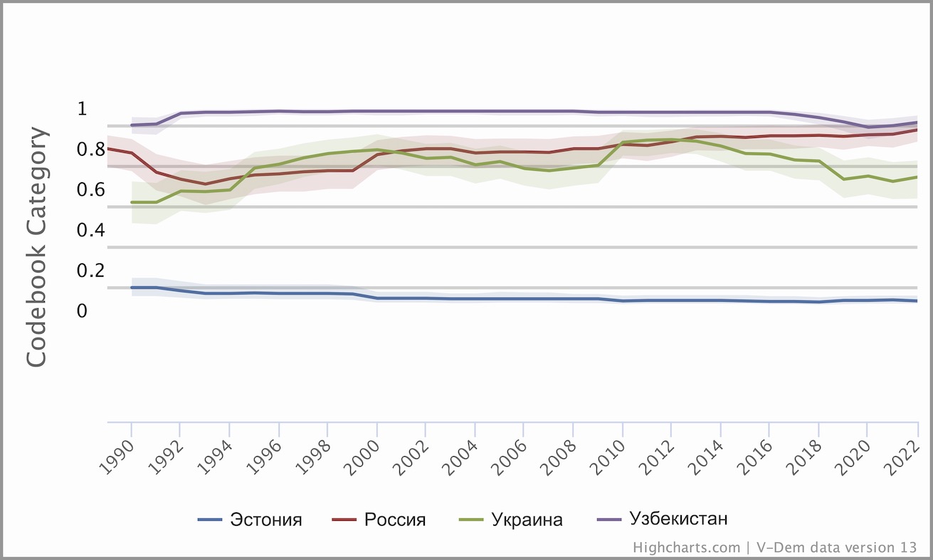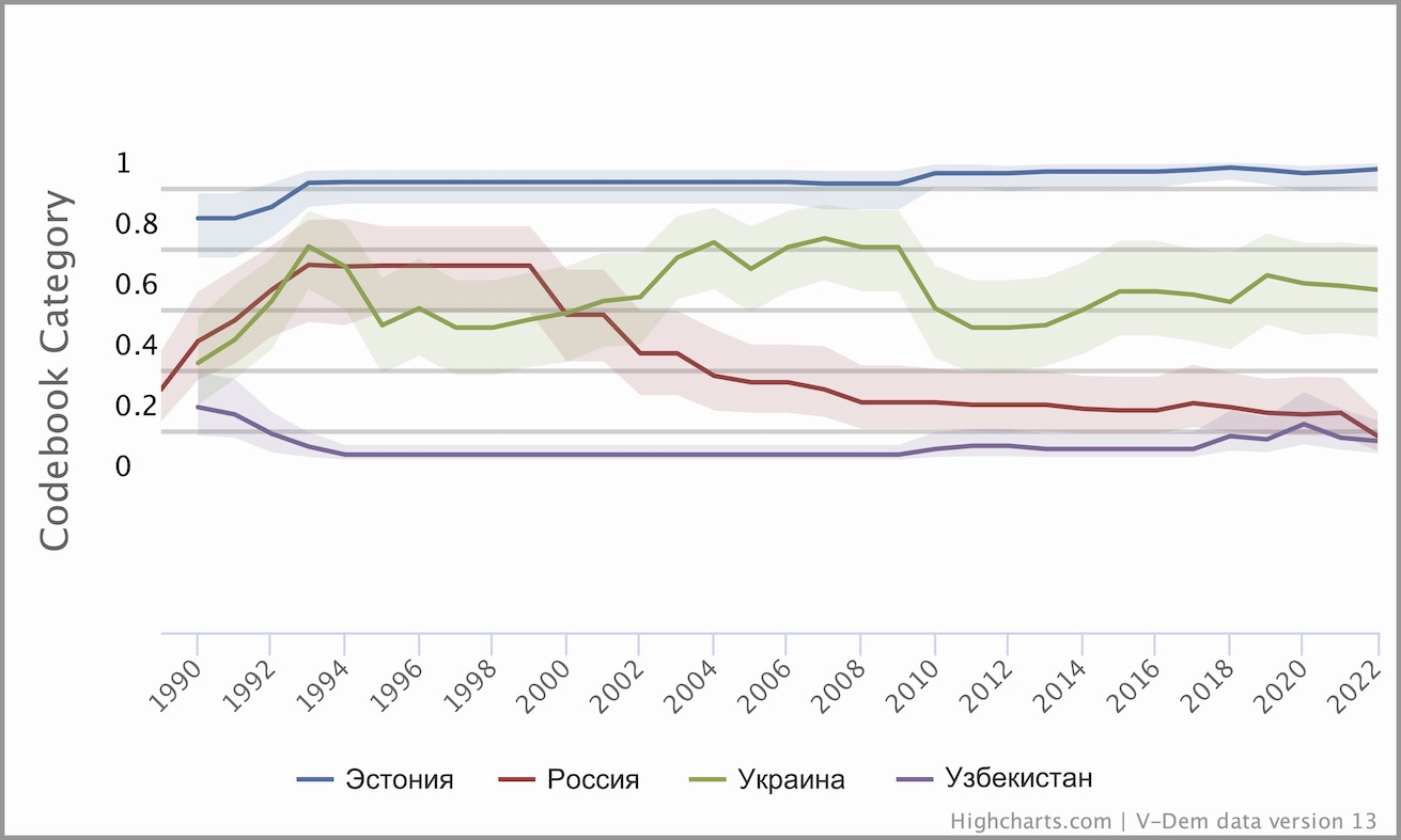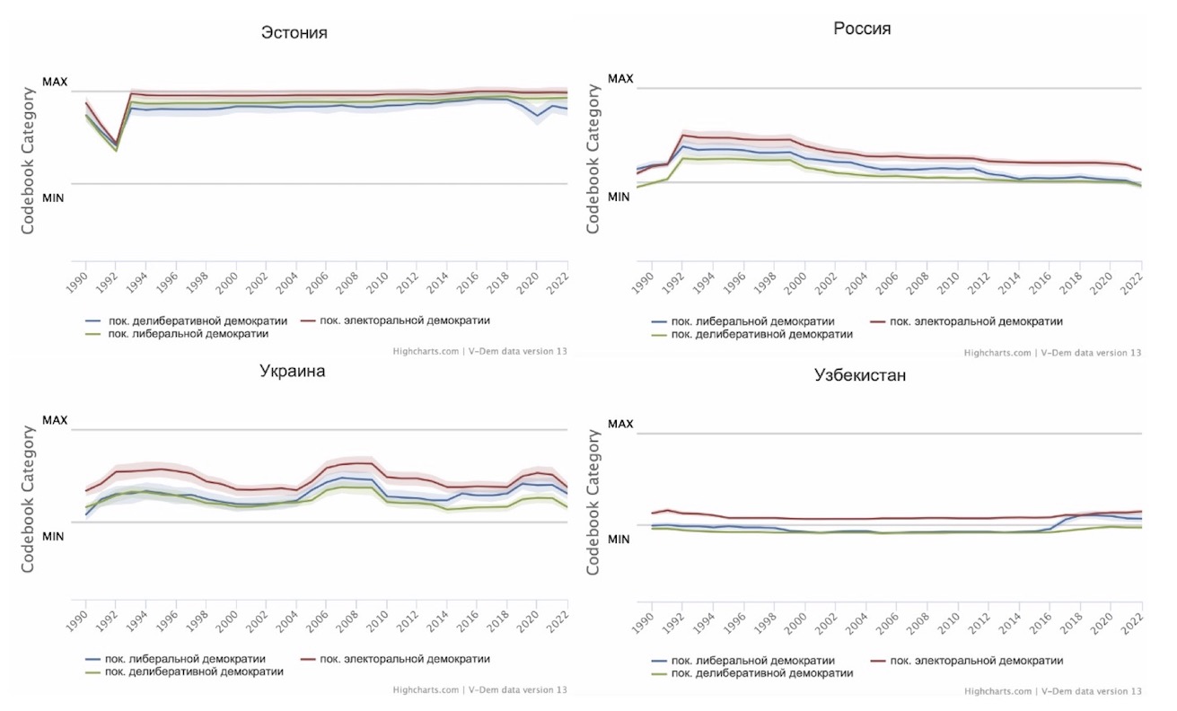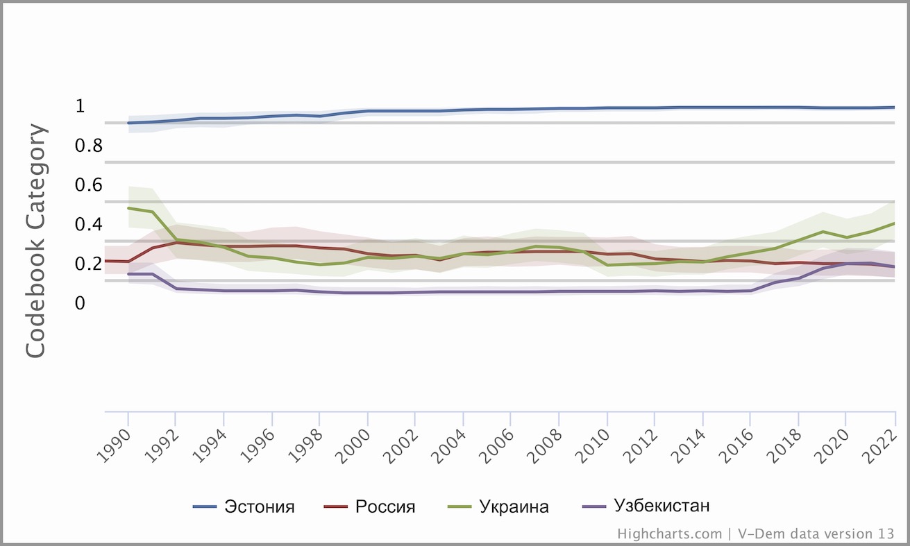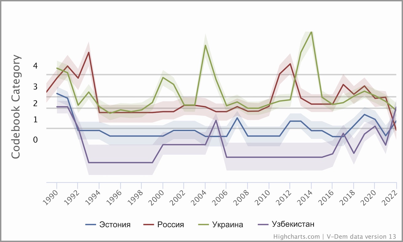 Тут и далее в этом разделе измерения индексов и других показателей взяты из базы данных V-Dem. В большинстве случаев сравнение постсоветских процессов ведется по четырем страновым кейсам* — Эстонии, России, Украине и Узбекистану. Эстонский пример — парламентская республика со стабильно высокими показателями демократического развития, при сильном влиянии институтов Совета Европы, ЕС и НАТО. Россия — пример президентской республики, пережившей период демократизации, но затем упадок демократии перерос в период глубокой автократизации, при некотором влиянии институтов Совета Европы. Украина — пример смешанной республики с несколькими переходами от роста к упадку демократии и от роста к упадку автократии, при некотором влиянии институтов Совета Европы и ЕС. И, наконец, Узбекистан — пример президентской республики с долгой автократизацией после очень недолгого периода демократизации, с минимальным влиянием извне на политические структуры страны. ↩︎