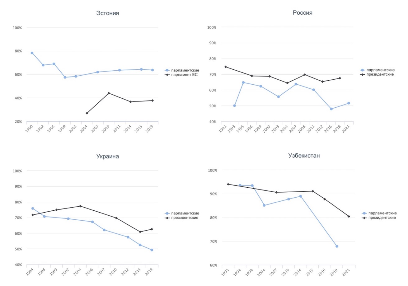 В дальнейшем электоральный элемент демократии стал самым сильным институтом, влияющим на «неконтролируемую ротацию властных элит» (что отчасти выжило даже в странах, управляемых постсоветскими авторитарными режимами в 2010-х годах). Как видно из графика 5, в нашей выборке четырех страновых кейсов признание важности выборов демонстрируется постоянным значительным (50 процентов и более) участием избирателей во всех выборах президентов и парламентов. Стоит отметить, что выборы президентов, как правило, привлекают больше избирателей, чем парламентские выборы; это видно по паттерну явки в российском, украинском и узбекистанском кейсах. Эстонский кейс свидетельствует, что участие в выборах национальной легислатуры стабильно выше, чем в Европейский парламент.
