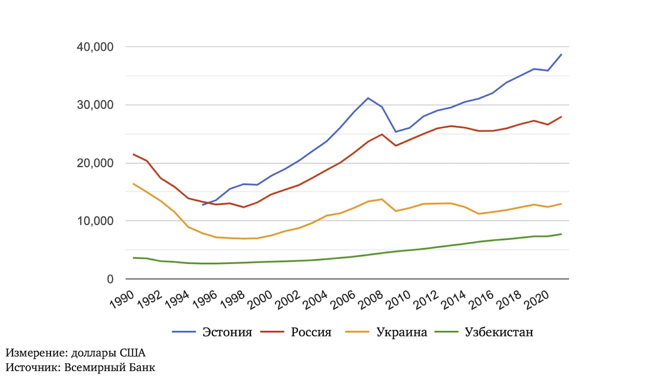 График 11. ВВП на душу населения, рассчитанный по паритету покупательной способности (доллары США) (Эстония, Россия, Украина и Узбекистан, 1990–2020 гг.)#