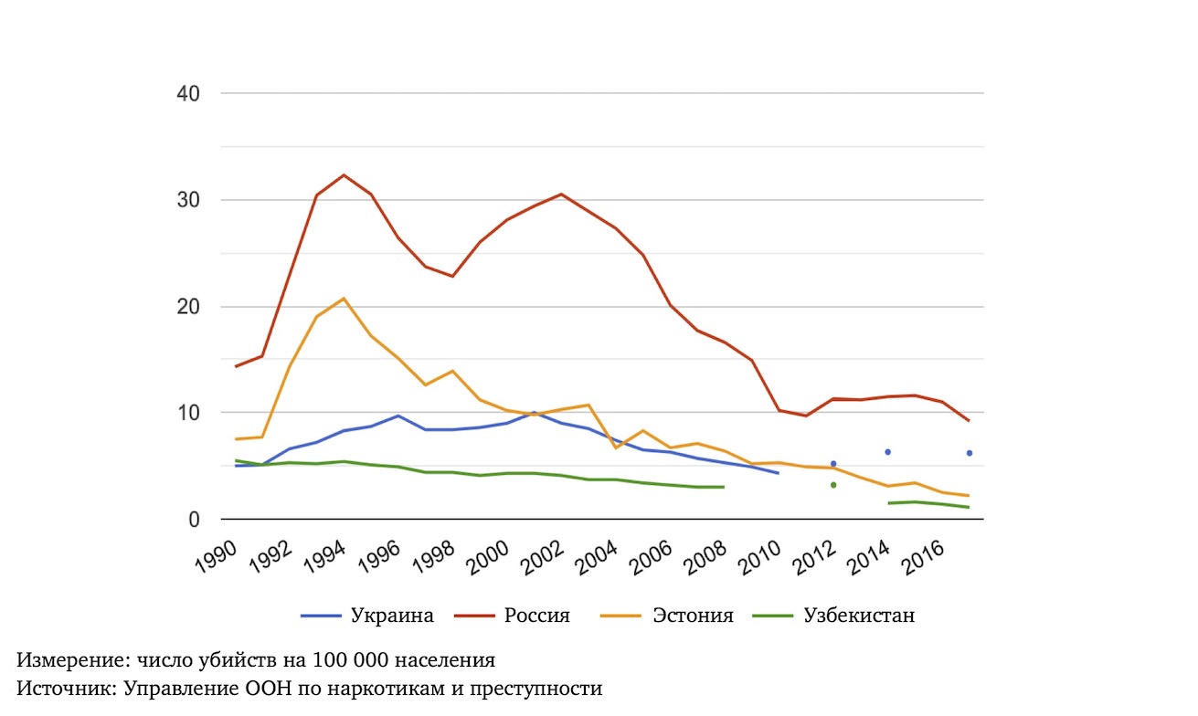 График 12. Число убийств на 100 тыс. населения (Украина, Россия, Эстония и Узбекистан, 1990–2016 гг.)#
