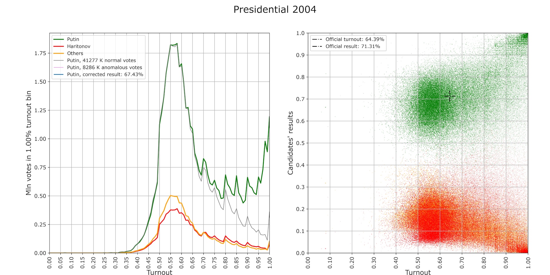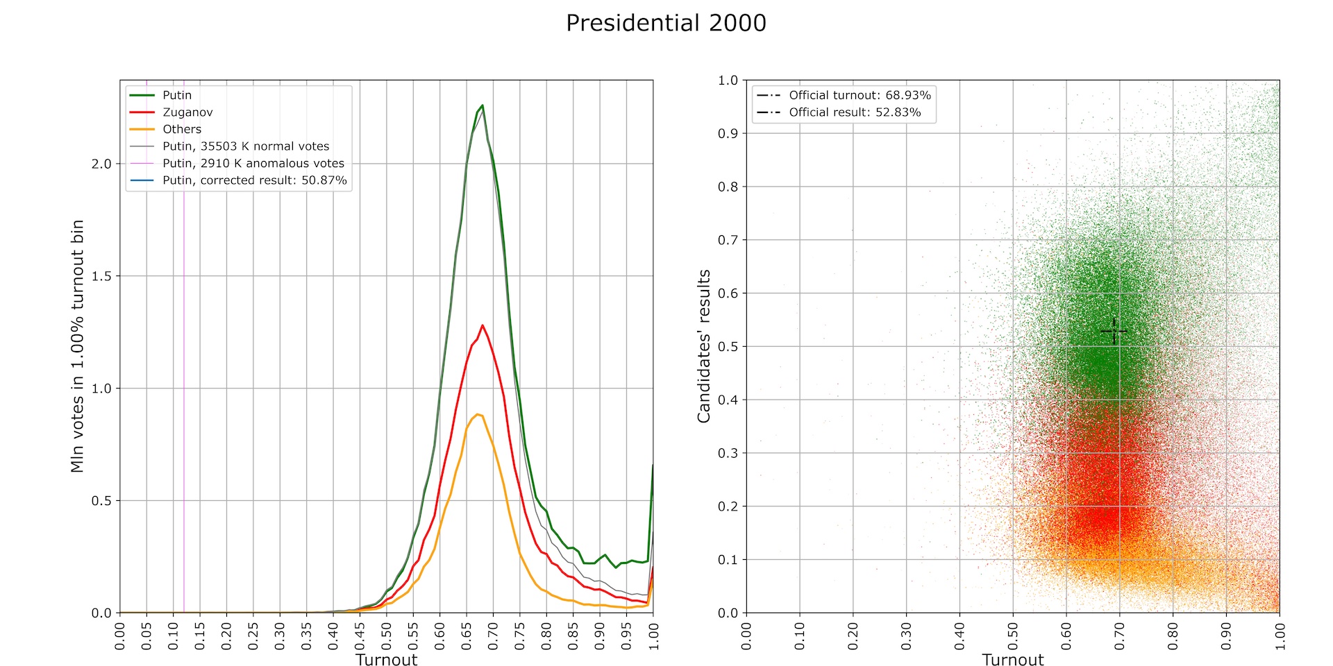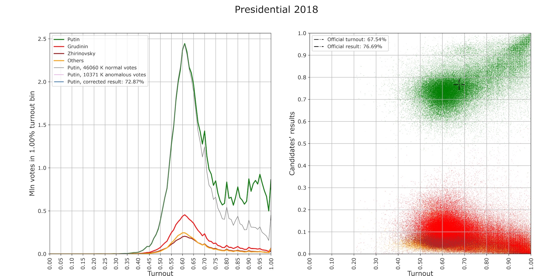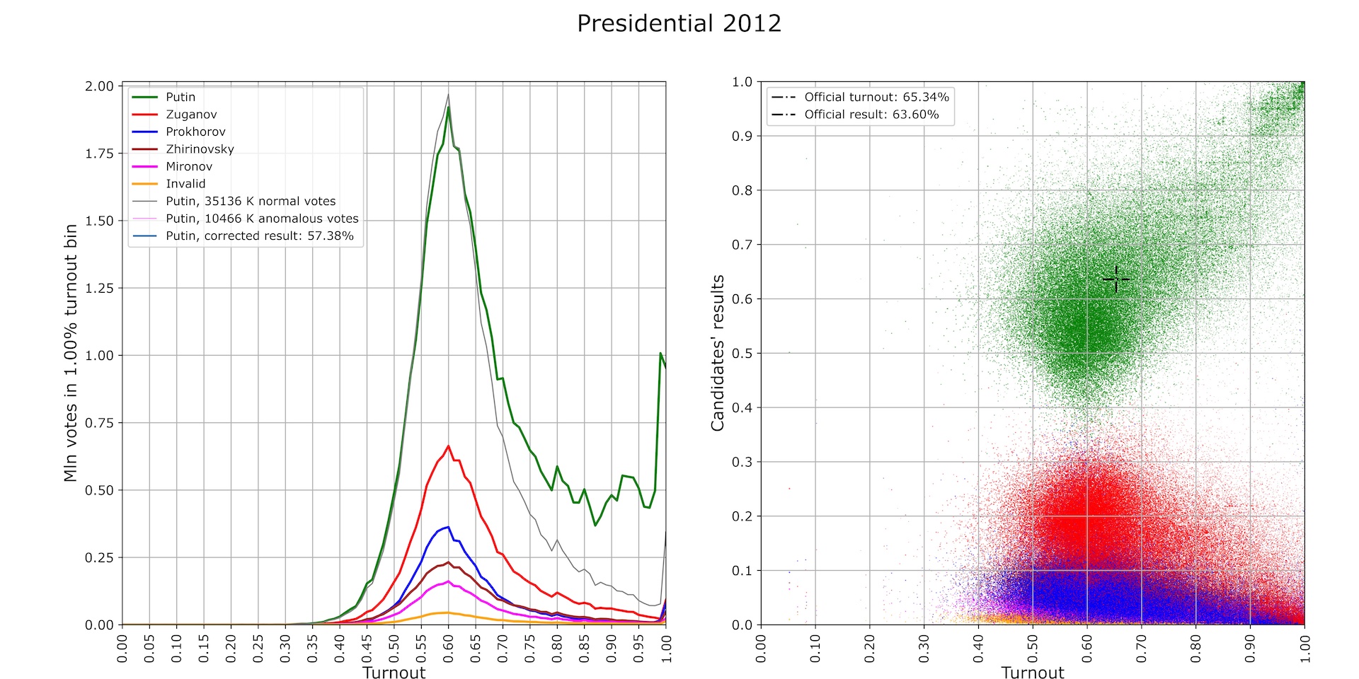 The distribution of the results of the administrative candidate (Vladimir Putin) at the polling stations in the turnout-result axes is a compact cluster around the official result (black crosshairs), while the distribution of votes for the administrative candidate is shaped almost the same as the distribution of votes for other candidates. The number of anomalous votes is minimal by Russian standards—less than 3 million—although subtracting it from the number of ballots and the number of votes for Putin gets the latter dangerously close to a runoff (Fig. 2).