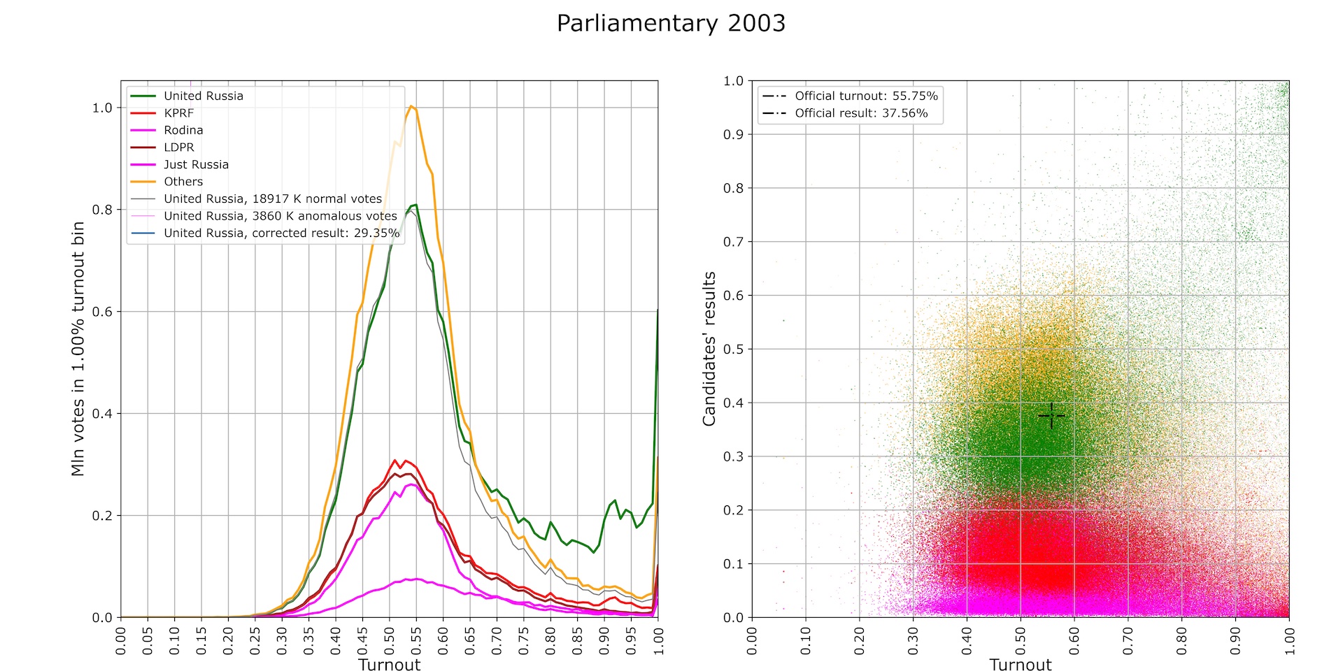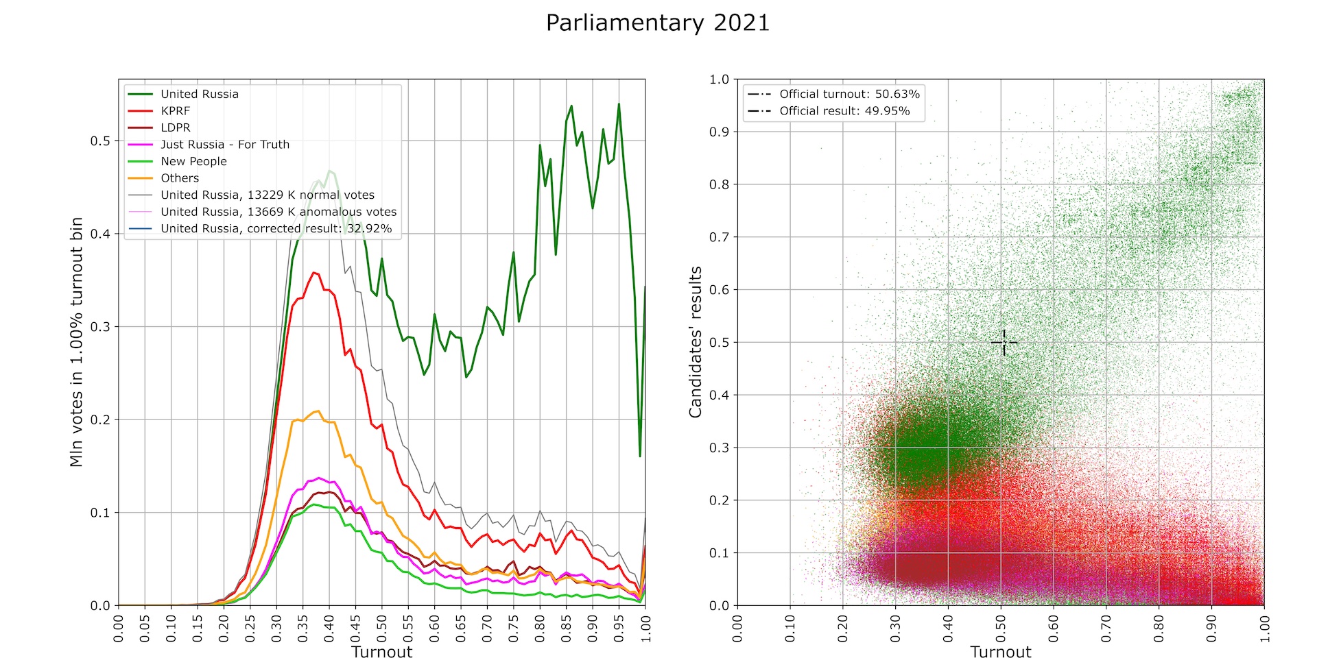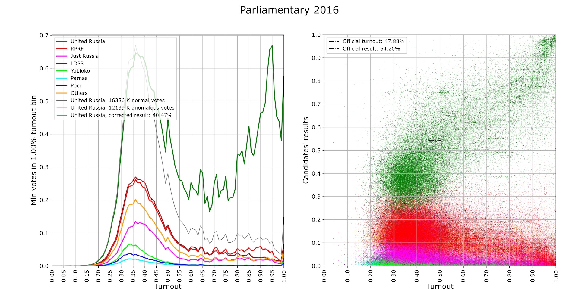 - Taken together, those mean that UR received the smallest absolute number of votes in the history of federal voting. The official turnout and UR result (black crosshairs in the right panel) ended up well off into the wilds: there are hardly any polling stations in the vicinity. On the whole, these results show a full divorce between the official election results and political reality (Fig. 12).