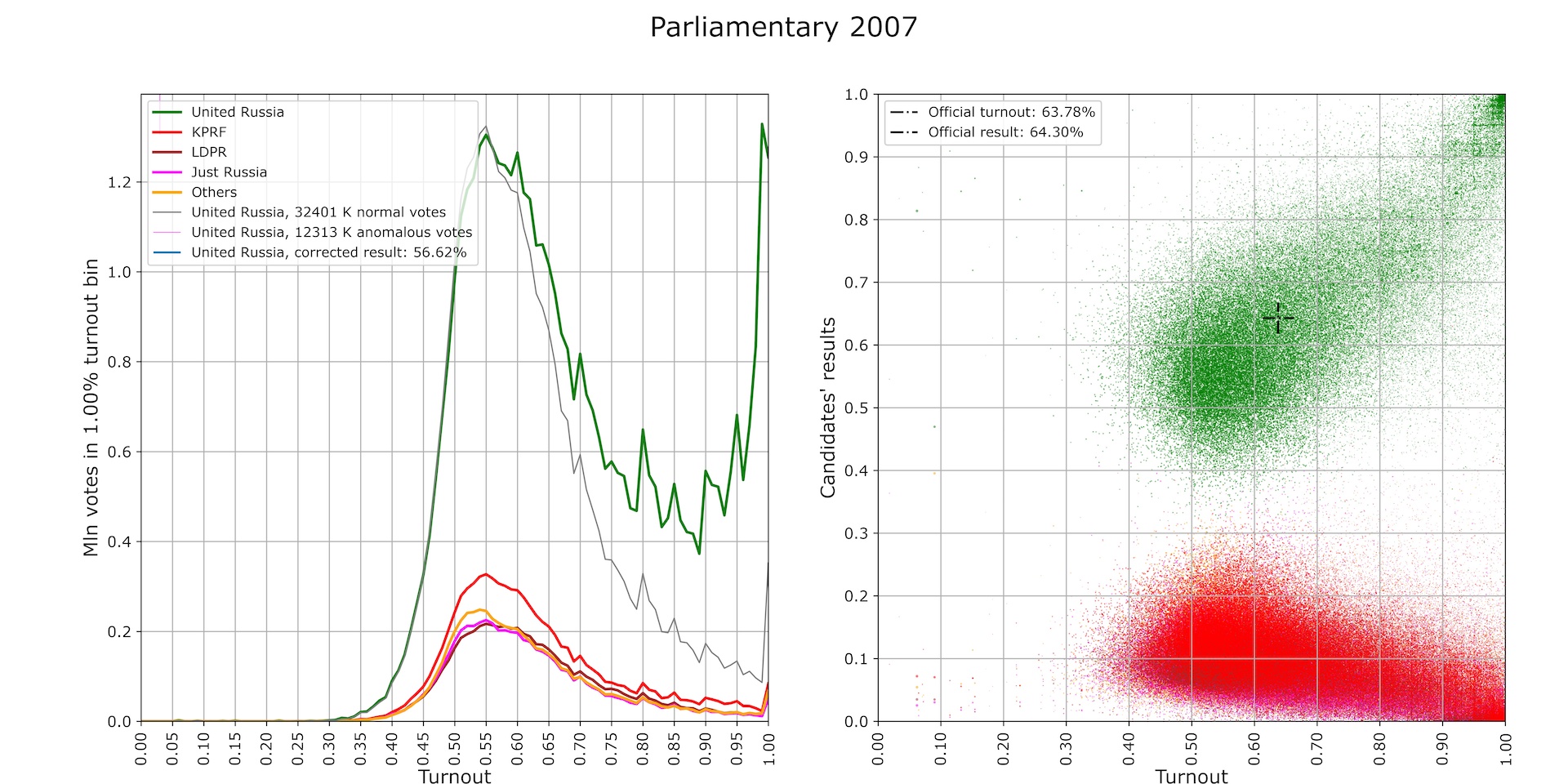 In the parliamentary elections of 2007, the “tail” grows further, and the number of anomalous votes for United Russia reaches 12 million. It was these anomalous votes that provided United Russia with a qualified majority in the new parliament (Fig. 5).