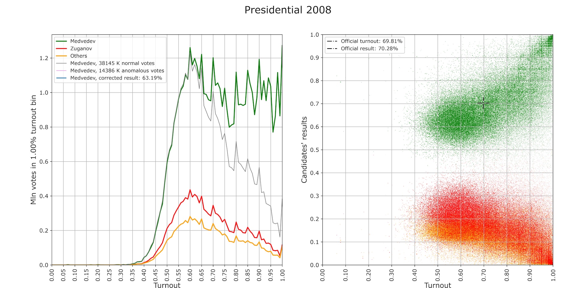 The A-candidate part of the scatterplot in the right panel looks like a “comet” consisting of two fundamentally different parts: a compact “nucleus” localized around a turnout value of about 45% and a result of about 65% and a “tail” extending towards 100% turnout and result. At the same time, the tail, unlike the nucleus, exhibits a distinctive grid pattern: precincts tend to concentrate around integer percentages, especially multiples of 5%. Another important detail is that the final official values of turnout and result (shown by the crosshairs) fall “into the middle of nowhere”—between the nucleus and the tail, where the density of polling stations is significantly less than in either the former or the densest part of the latter. That is, it turns out that there are uncharacteristically few “country-average” polling stations, much fewer than polling stations with higher or lower values of turnout and result.