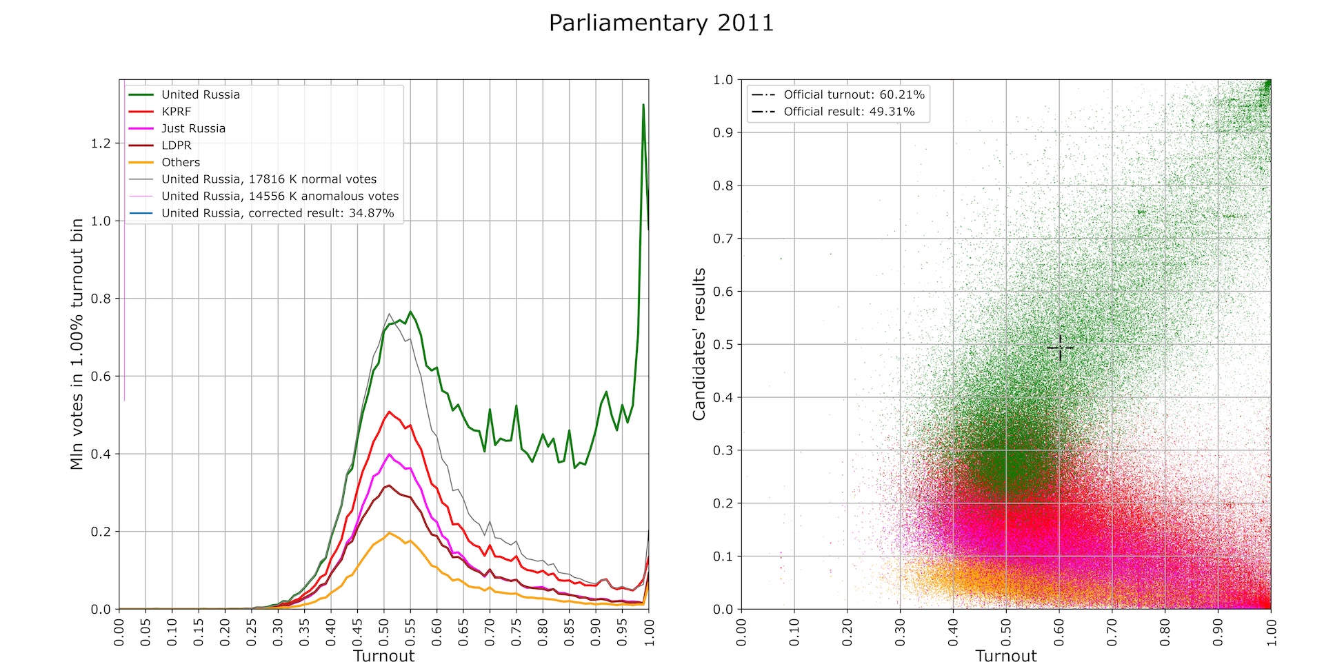Until recently, the parliamentary elections of 2011 shared with the presidential elections of 2008 the title of the most “anomalous.” The number of anomalous votes once again exceeded 14 million, and “Churov’s saw,” having been subject to some public discussion, weakened in the distribution of turnout, but grew stronger in the distribution of the result of United Russia (horizontal lines in the “comet’s tail”). The anomalous votes provided United Russia with a simple majority in parliament (Fig. 7).