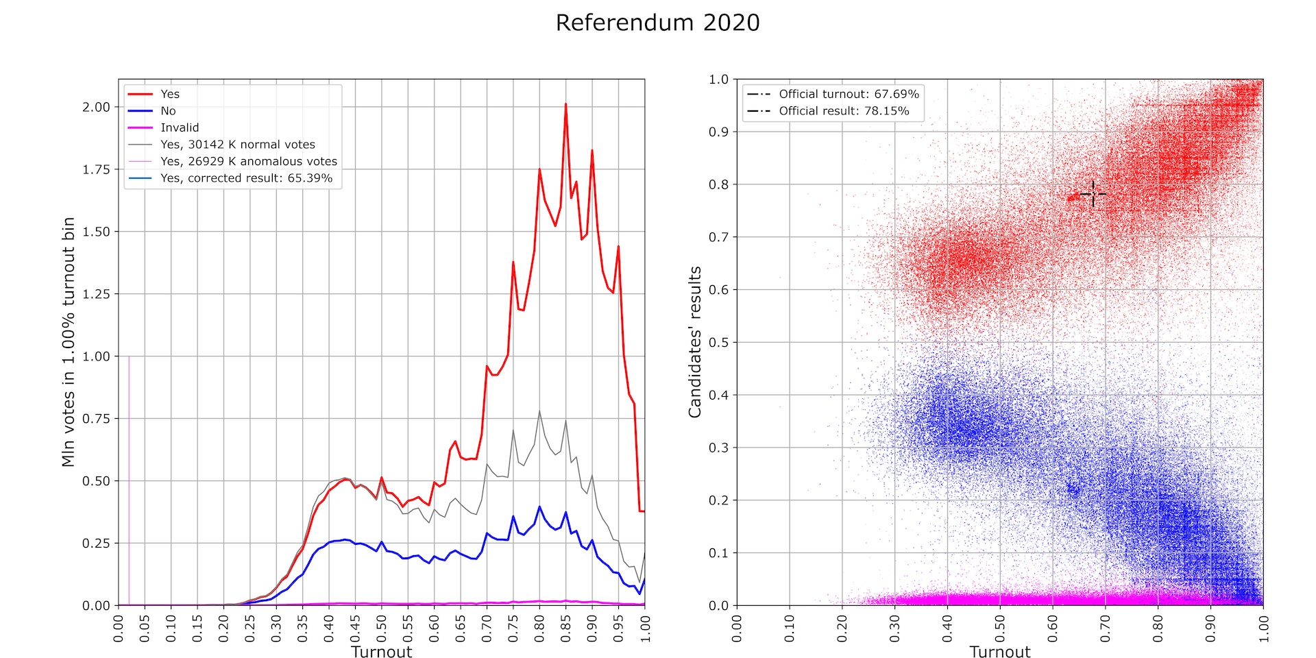 The election data available to us is multidimensional in an essential way: for each polling station there is data on the number of registered voters, the number of ballots cast for each candidate, the number of invalid ballots, as well as the approximate turnout reported throughout the election day. Each precinct is also inextricably embedded among its neighbors (spatial context), has a record of previous and simultaneous elections (temporal context), etc. This multidimensionality, on one hand, facilitates the identification of possible anomalies, and on the other, makes it necessary to pre-process the data for visualization in order to provide an overview of the voting before getting into the details. In our analysis, we visualize polling station data as two “projections” presented in a two-panel chart. An example of such a chart for the vote on amendments to the Constitution of the Russian Federation is shown in Fig. 1 (below).