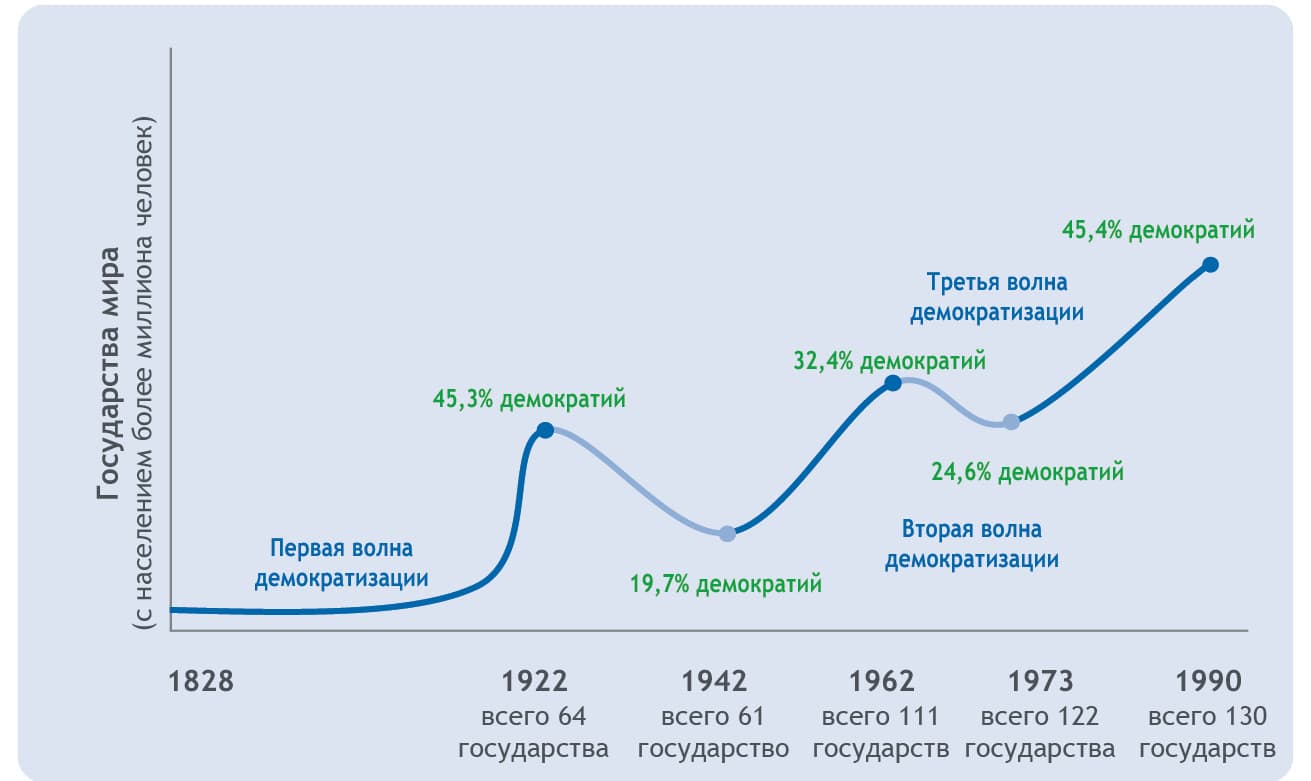 Рис. 2. Пятиволновая модель Хантингтона: между демократизацией и дедемократизацией