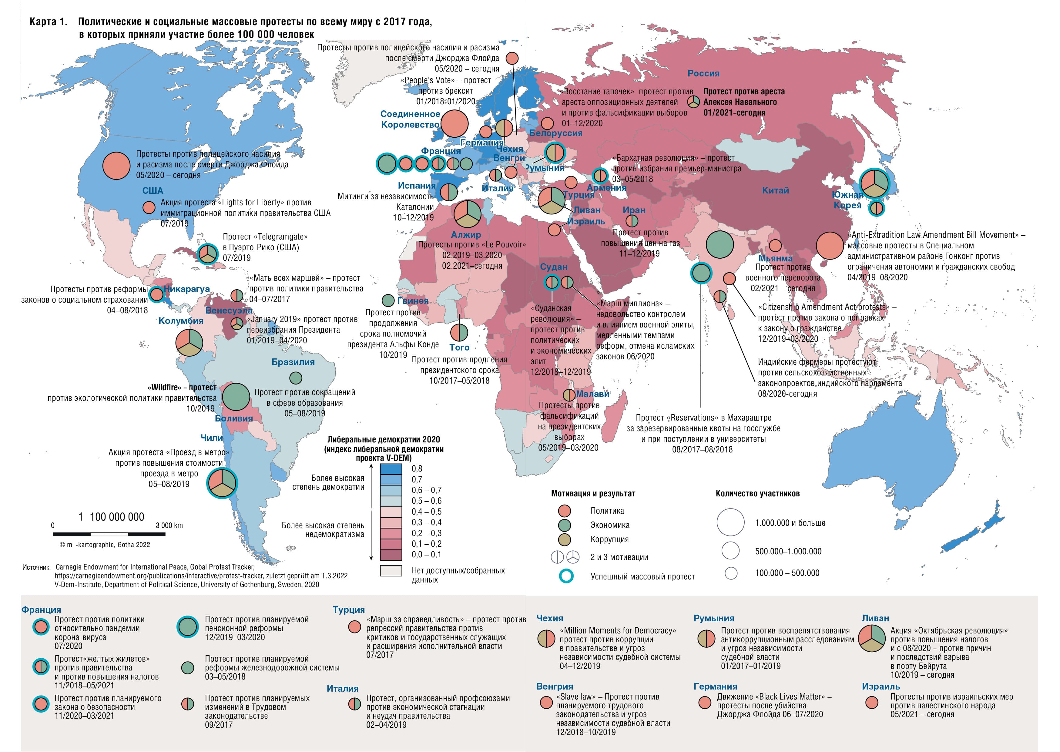Карта 1. Политические и социальные массовые протесты по всему миру с 2017 года, в которых приняли участие более 100 000 человек