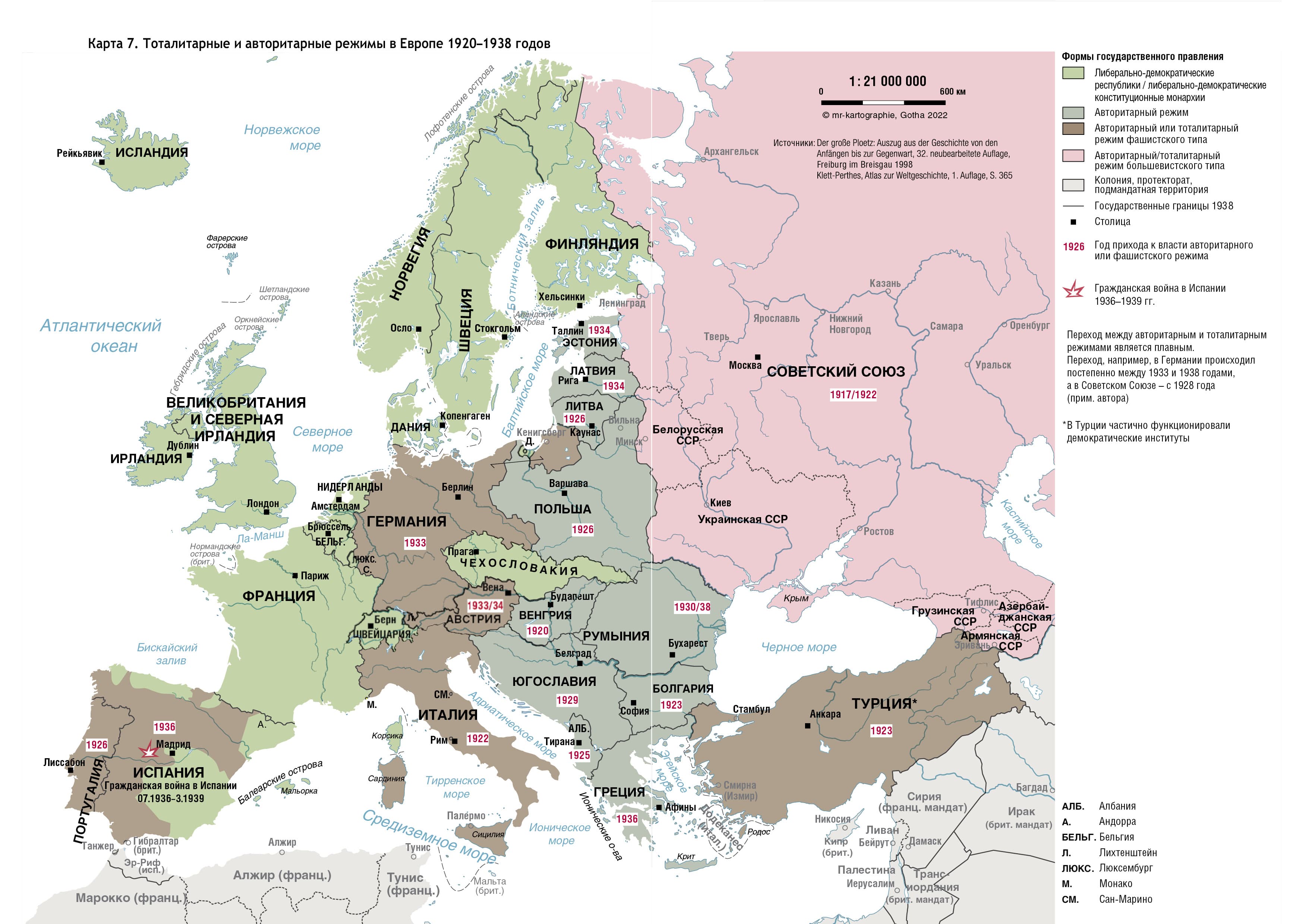 Карта 7. Тоталитарные и авторитарные режимы в Европе 1920–1938 годов