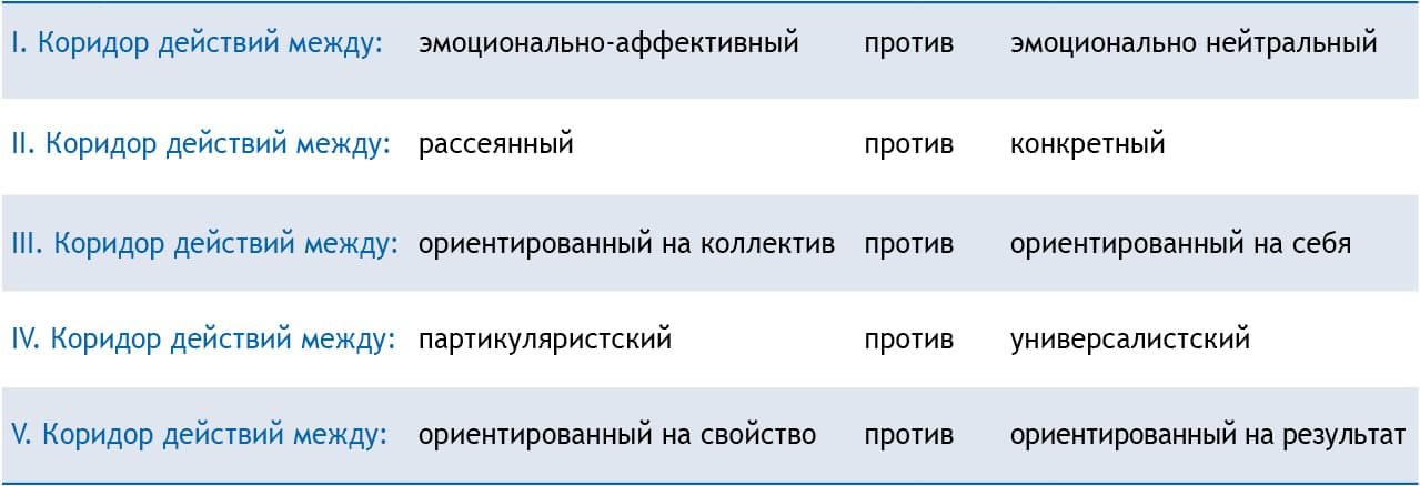 Рис. 41. Пять коридоров действий («переменные шаблона») в соответствующих крайних точках