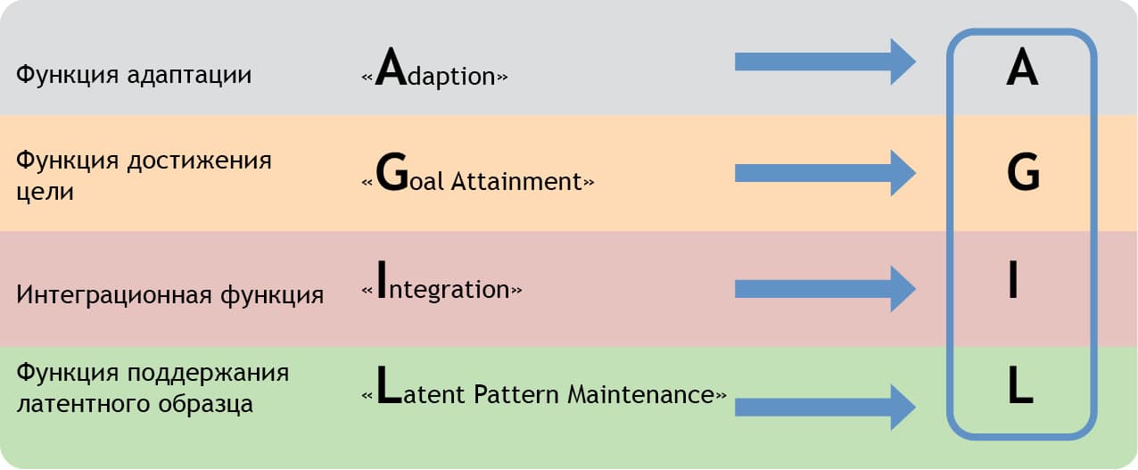 По Парсонсу, любая система социальных действий независимо от исторической эпохи, принадлежности к культурному кругу, размеров или конкретного своеобразия должна в конечном счете выполнять четыре вышеуказанные функции (AGIL), чтобы обеспечить себе выживание на долгую перспективу. Так что разработанная им абстрактная системная модель является универсальным аналитическим инструментом, который позволяет идентифицировать социальные феномены как функциональные структуры и процессы, играющие определенную роль для своей собственной подсистемы, более высокого уровня системы или системы в целом. Например, современное общество в целом (modern society) как важнейшую из всех социальных систем, относящихся ко второму уровню действий, Парсонс подразделяет соответственно на экономическую подсистему, выполняющую путем переработки ресурсов и производства товаров функцию адаптации (A), политическую подсистему, которая своими общеобязательными решениями относительно курса движения способствует коллективному целедостижению (G), общественную подсистему, гарантирующую наличие конкретных норм и тем самым усиливающую коллективную интеграцию (I), и, наконец, культурную подсистему, обеспечивающую легитимную основу удовлетворению экономических потребностей, политическим правилам и общественным нормам и тем самым сохранение структуры в целом (L).