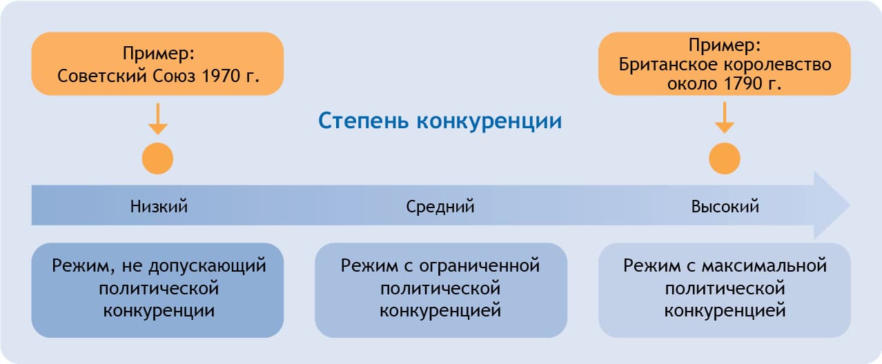 Далее, чтобы раскрыть потенциал своей концепции полиархии для апостериорного кумулятивного анализа, Даль следующим шагом интерпретирует названные восемь гарантий как два теоретических измерения (аспекта) демократизации. Первое из них — измерение конкуренции («публичного оспаривания» / contestation); этот критерий отражает масштаб и объем, в котором политической оппозиции предоставлена возможность вступать с действующим правительством в открытую, свободную и честную конкурентную борьбу за политическую власть, руководящие должности и полномочия принимать решения. Сюда же относится наличие у оппозиционных групп возможности объединяться, создавая общественные и политические организации и партии, открыто выражать свои политические взгляды и интересы, а также свободно и без ограничений привлекать политическую поддержку и новых членов. Еще одна составляющая — безоговорочный доступ оппозиции к выборам, возможность беспрепятственно выставлять свои кандидатуры и вести предвыборную борьбу, причем на базе неограниченного плюрализма альтернативных источников информации, то есть в отсутствие всяческой цензуры, государственной или частноправовой монополии на средства массовой информации. На соответствующей данному аспекту шкале Королевство Великобритания в довикторианскую эпоху с его развитым соперничеством между партиями вигов и тори заняло бы, например, позицию близко к полюсу максимального уровня конкуренции, а место однопартийного режима социалистического Советского Союза в эпоху Брежнева было бы в точке около нуля.