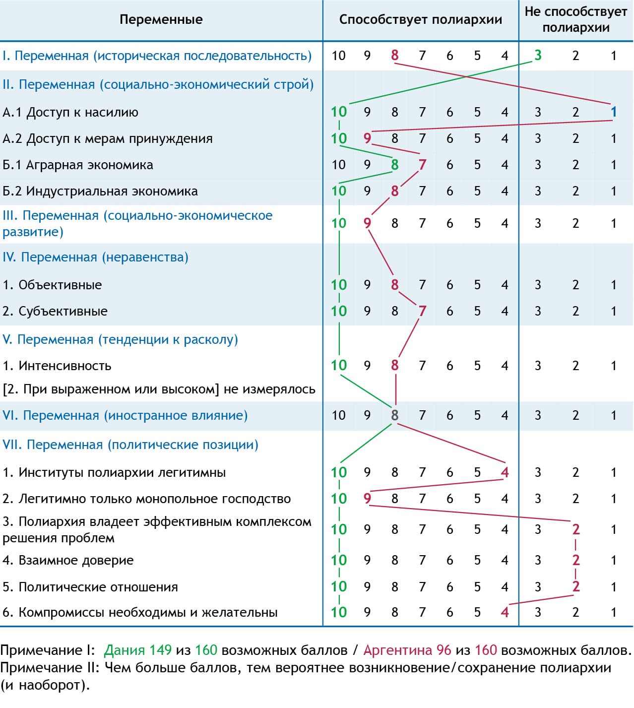 Рис. 58. Семь переменных, имеющих значение для сохранения/возникновения полиархии на примере Дании (здесь зеленый)/Аргентины (здесь красный) (в 1970 г.)