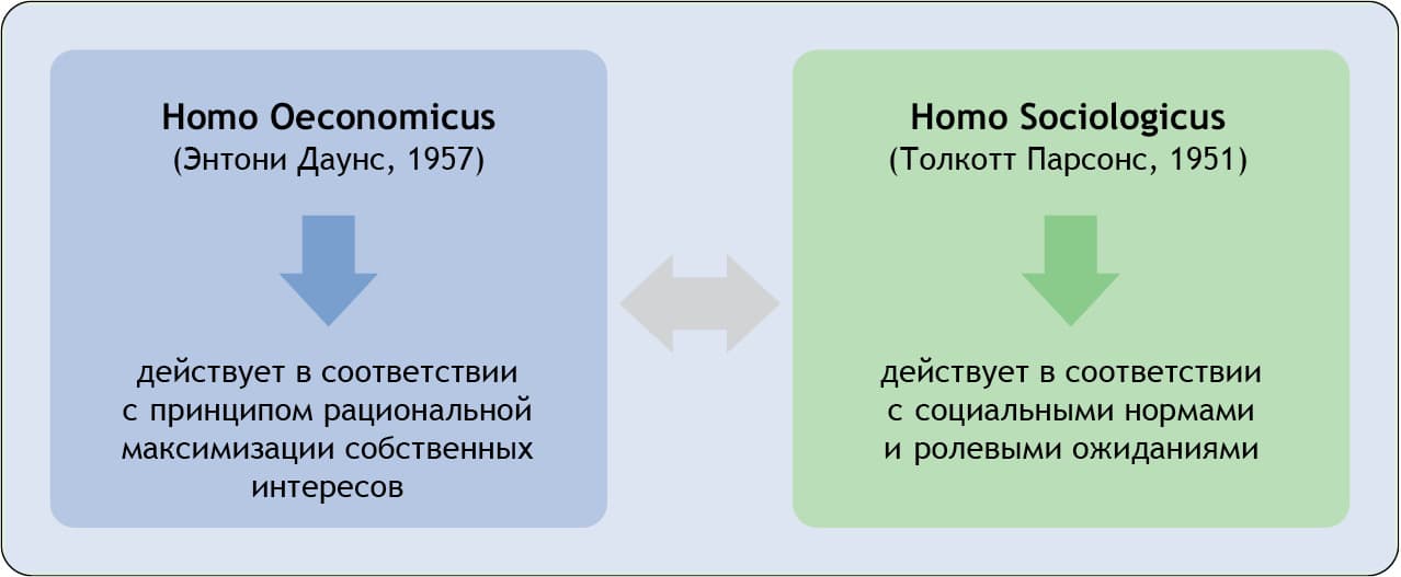 В соответствии с этой намеренной теоретической редукцией акторы в модели Даунса действуют исключительно рационально и эгоистично. Рационально означает в данном случае, как и у Кеннта Эрроу, научного руководителя Даунса («Коллективный выбор и индивидуальные ценности», 1951), что каждый человек всегда выбирает из ряда альтернатив действий те, которые максимально приближают его к осуществлению целей его действий, что каждый человек в состоянии ранжировать имеющиеся у него альтернативы действий согласно своим конкретным приоритетам и что выстроенные таким образом последовательности всегда внутренне непротиворечивы и всегда остаются одинаковыми при неизменности обстоятельств. Идею индивида, руководимого исключительно своими эгоистическими целями, то есть полезностью лично для себя, Даунс почерпнул из классической политэкономии XIX века, которая, в свою очередь, позаимствовала этот спорный и уже тогда резко критикуемый конструкт стремящегося только к собственной выгоде homo oeconomicus у шотландских просветителей и моральных философов XVIII века (Дэвида Юма, Адама Смита и др.). Соответственно, в исходной модели Даунса, где осуществлен симбиоз homo oeconomicus с парадигмой рациональности Эрроу, все экономические и политические акторы стремятся с применением наиболее эффективных средств, находящихся в их распоряжении, и с минимальными возможными затратами получить максимальную полезность для себя — они действуют как рационально-эгоистичные максимизаторы полезности. Опираясь на такой образ человека, Даунс занимает позицию, диаметрально противоположную не только базовой гипотезе структурного функционализма Парсонса и выводам Берельсона и Лазарсфельда в работе «Голосование» (1954), но и взглядам Шумпетера, своего крестного отца в теории демократии. Последний категорически и резко отвергал и опровергал положения англо-австрийской школы теории предельной полезности, исходившей из того, что экономические субъекты (потребители, торговцы и производители) оперируют на основании расчета затрат и выгод, а также выступал против представления, что рядовые индивиды способны действовать в политической сфере рационально и стратегически. При этом следует помнить, что в модели Даунса на homo oeconomicus распространяются те же оговорки, что и на все прочие аксиомы: он хотя и воплощает непреложный примат рациональности как средства и эгоистического интереса как основного мотива всех социальных действий, однако в то же время остается идеально-типическим вспомогательным конструктом, который не претендует на отражение всей сложности человеческой личности и не оспаривает существование нравственности, альтруизма, эмоций и иррациональности в человеческом поведении.