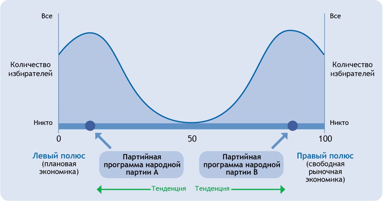 Идеологическая направленность и ориентация политических партий, нацеленных на максимизацию полученных голосов, зависит от того, где в указанном континууме находится большинство общества. Так, в демократических системах правления, в которых основная часть электората занимает позицию идеологического центра, царит максимум политической стабильности, поскольку и конкурирующие массовые партии в своих программах склоняются к центру, где они могут надеяться на наибольшую электоральную добычу и, соответственно, демонстрируют идеологическую расплывчатость и индифферентность. И только страх потерять при этом слишком много голосов на своем изначальном, правом или левом, фланге удерживает в итоге крупные партии, постоянно сдвигающиеся к центру, от того, чтобы стать содержательно идентичными друг другу.
