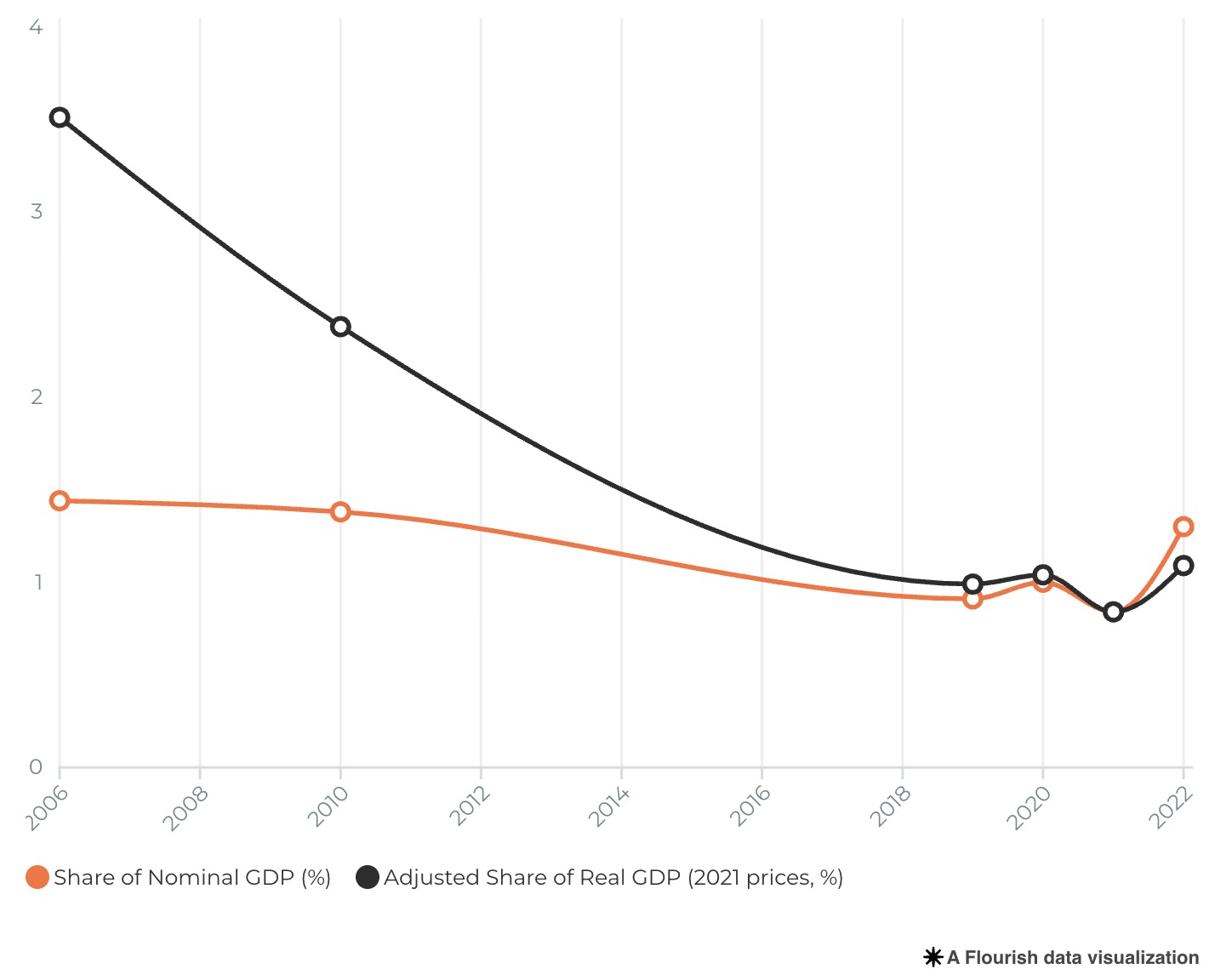 Although the nominal share of spending on higher education appears to decline over time, the real share (adjusted for inflation) reveals significantly higher investment levels in earlier years like 2006 and 2010 compared to the more recent period.