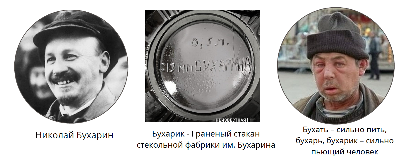 «Бухать» в значении «пить спиртное» связывают с названием знаменитого граненого стеклянного стакана, производившегося на стекольной фабрике имени Н.И. Бухарина в 1920–1930-е годы. Стекольный завод в городе Гусь-Хрустальный носил имя этого партийного вождя с 1924 по 1937. Граненые стаканы авторства знаменитой Веры Мухиной миллионными тиражами отправлялись в учреждения общепита огромной страны и были прозваны в народе сперва «бухаринский стакан», а потом просто «бухарик». Со временем церемония распития спиртного из этих стаканов со всеми сопутствующими социокультурными атрибутами стала называться «бухать». А опала Николая Бухарина, его последующий расстрел и разоблачения в прессе «подлых преступлений против советского человека» только укрепили в народе эту негативную коннотацию. Бухать, бухой, бухарь и бухарик — пожалуй, самые крепко отпечатанные в русском языке жаргонизмы подобного типа, т.е. сформированные из фамилии советских руководителей.