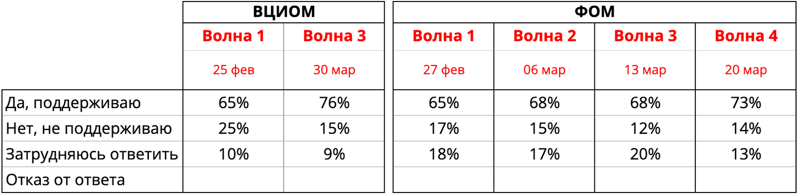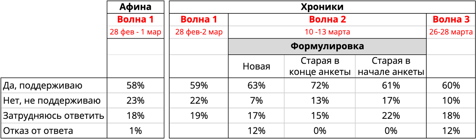 Формулировки вопросов отличаются незначительно и вполне сопоставимы. Итак, вопрос о поддержке военной операции в Украине.