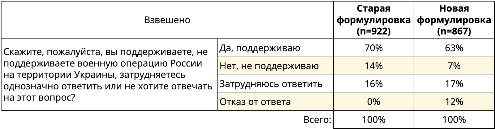Для 50% выборки вопрос звучал так: «Скажите, пожалуйста, вы поддерживаете или не поддерживаете военную операцию России на территории Украины?»
