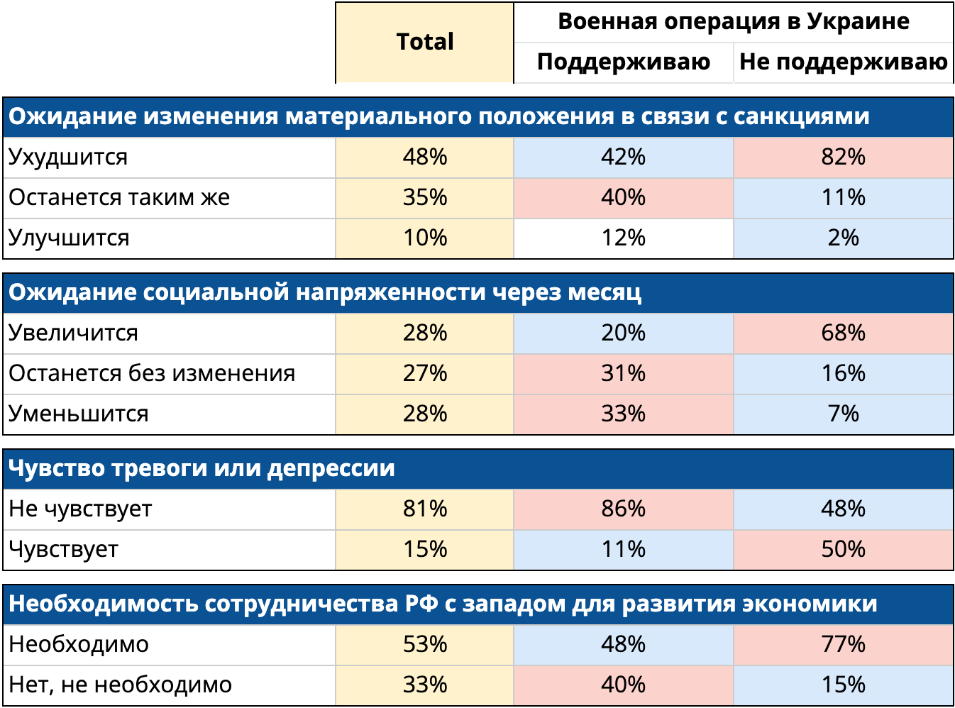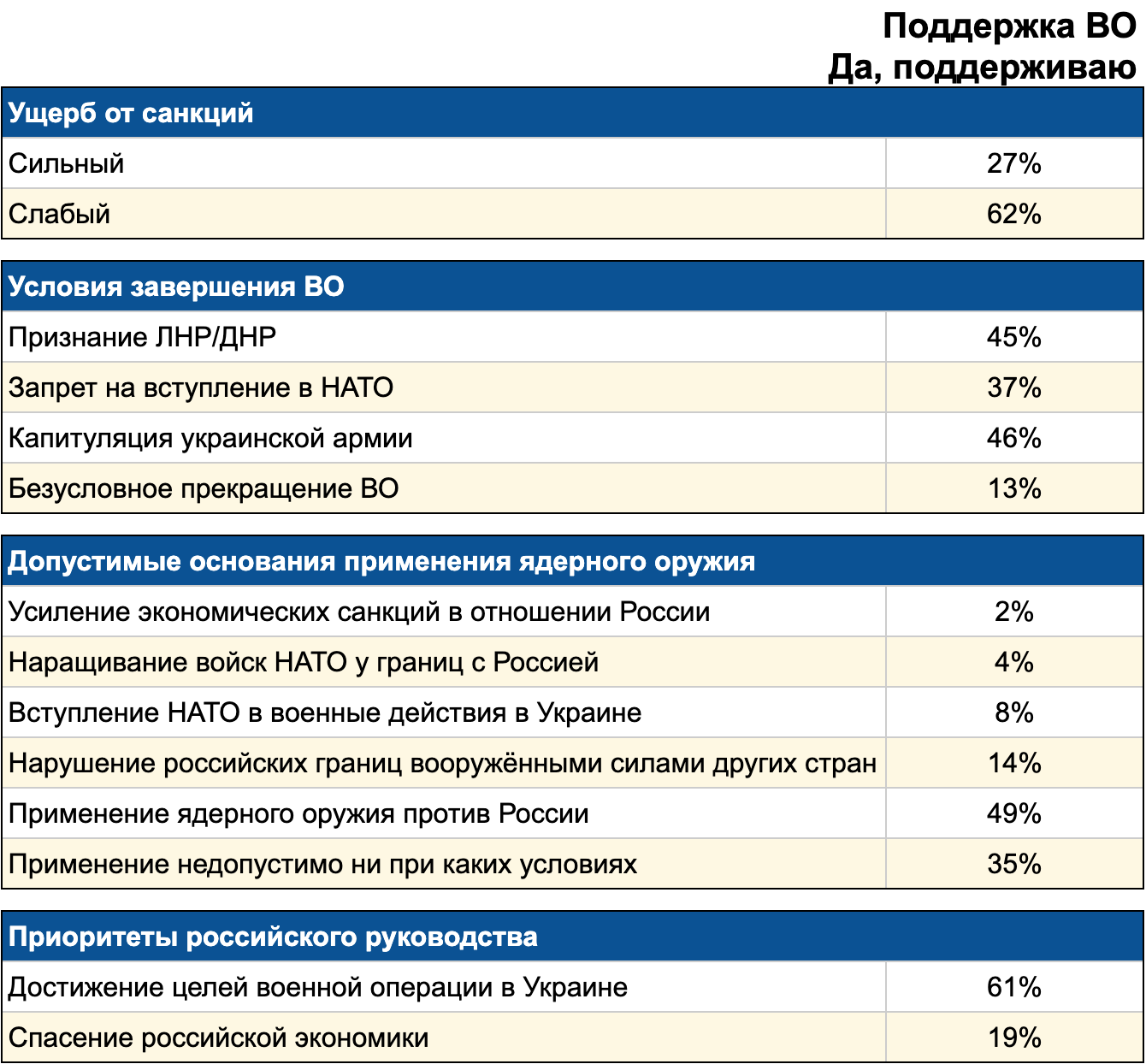 Даже если взять минимальную на сегодня оценку поддержки военной операции в 60%, эта группа весьма неоднородна. Мы работаем над необходимой в таком случае сегментацией, результаты которой представим в следующей публикации.