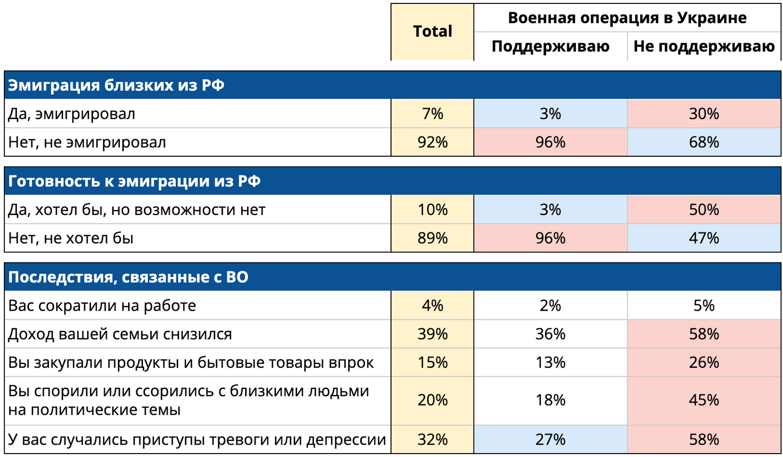 О том, что ухудшение экономической ситуации, личного материального статуса, потеря работы, надвигающаяся изоляция страны и стремительная эвакуация за рубеж сотен тысяч мобильных соотечественников — все эти последствия в восприятии многих людей существуют в отрыве от военных действий по «защите русских на Донбассе»?