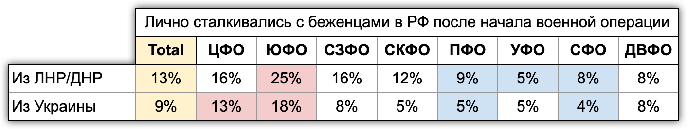 Сталкивались в России с беженцами из ЛДНР 13% респондентов, 9% — из Украины. Это, конечно, пересекающиеся группы.
