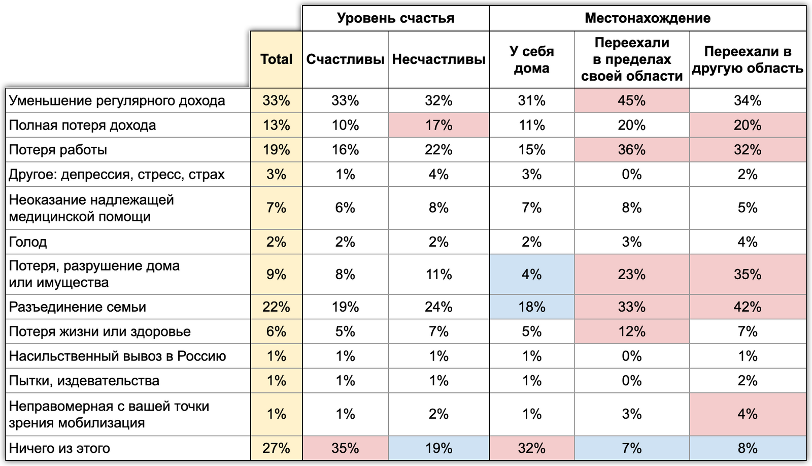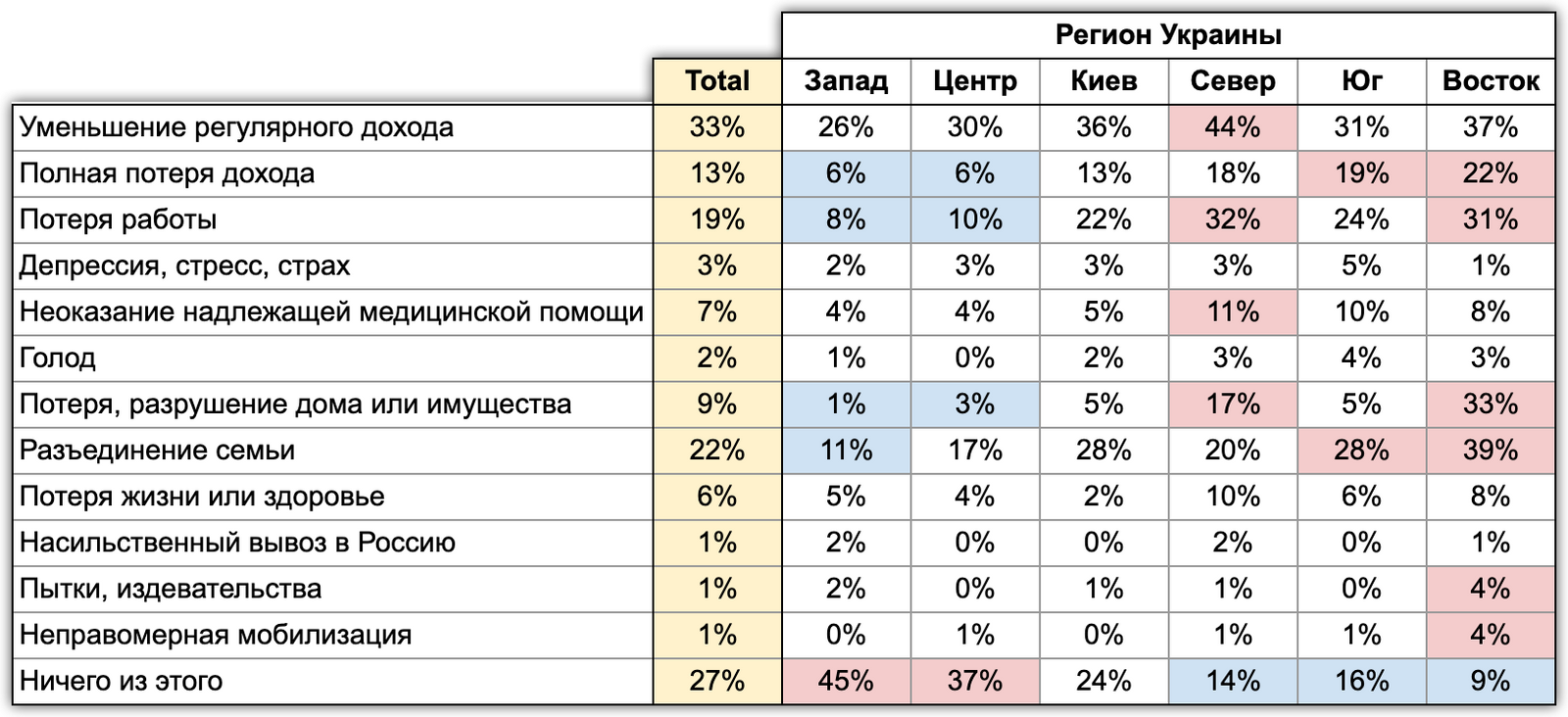Пытки, издевательства, неправомерная мобилизация в четыре раза больше, чем в среднем по Украине. Соответственно доля жителей востока, не затронутая перечисленными последствиями военных действий российской армии, составляет всего 9%, в то время как в Украине в целом 27%.