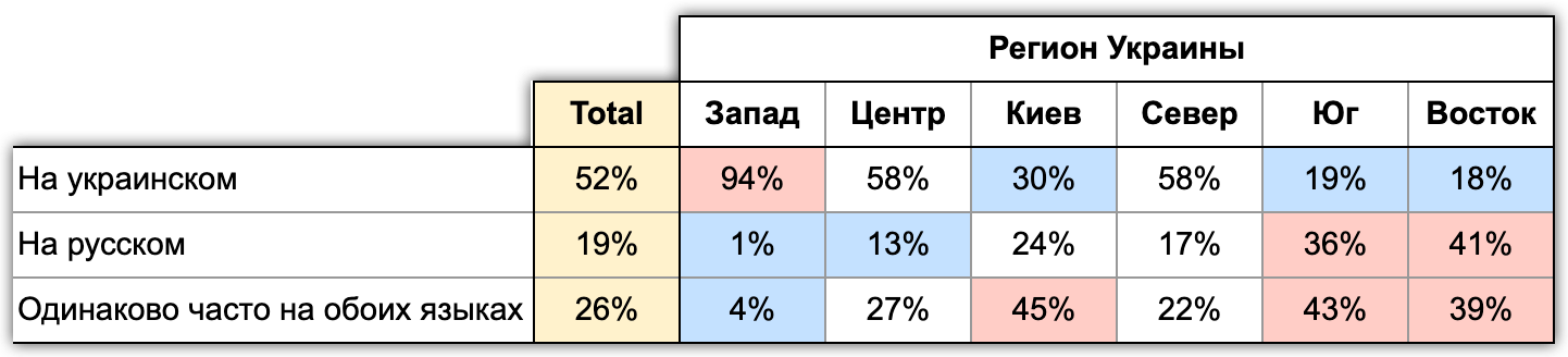 Таблица 7. Использование украинского и русского языка по регионам Украины (по данным исследования Info Sapiens)#