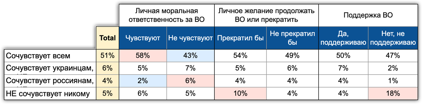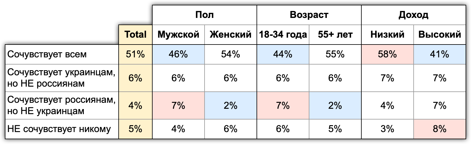 Мы надеемся, что наш релиз не только показал доли и проценты по разным параметрам общественного сознания, но позволил хоть немного понять масштаб последствий вторжения. Позволил заглянуть в сознание и душу людей воюющих сторон.