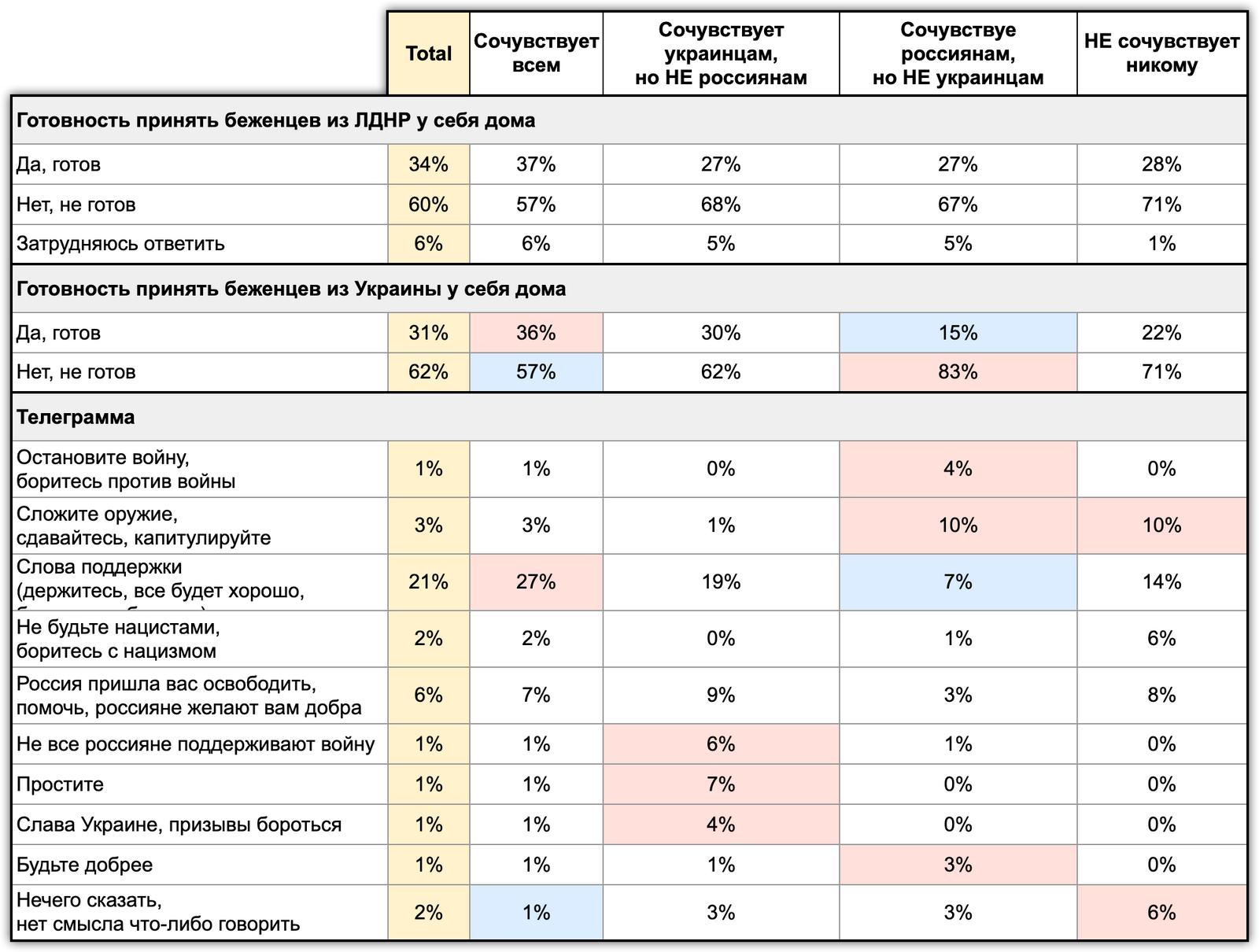 В русских телеграммах проективно можно увидеть природу сочувствия. Более артикулированно поддержку выражали респонденты, сочувствующие украинцам. Они же писали: «Не все поддерживают войну», «Простите», призывали бороться.