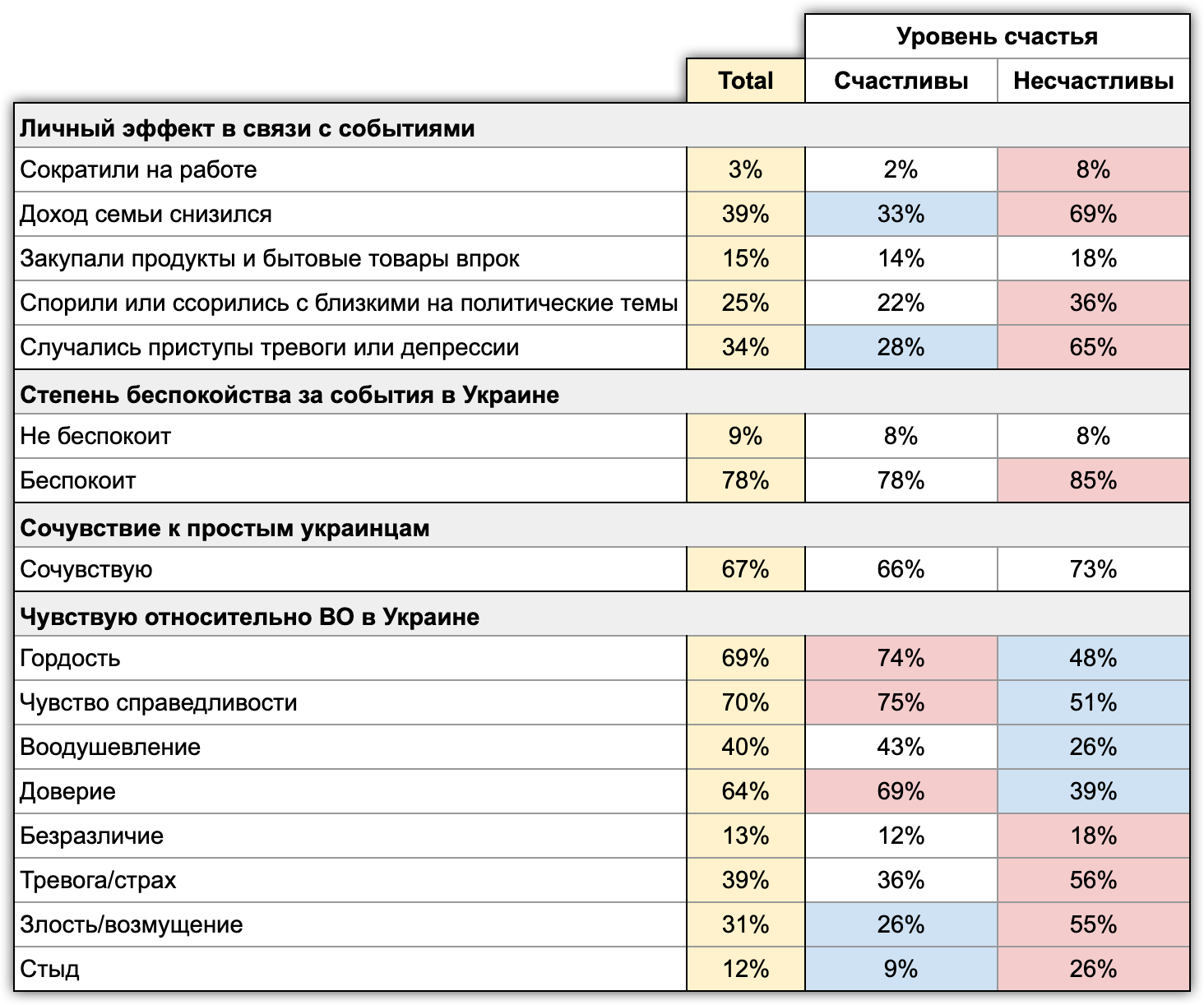 Противники операции в большинстве чувствуют себя несчастливыми: в нынешней ситуации трудно испытывать счастье, если ты не веришь в справедливость и оправданность военной операции, которую ведет твоя страна. Эти люди испытывают приступы депрессии, ссорятся с близкими. Их больше беспокоят события в Украине, и они несут за них личную ответственность.