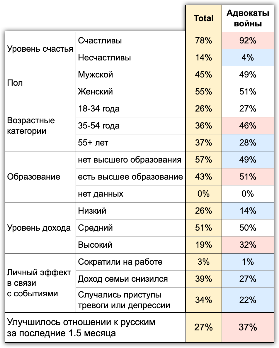Мы назвали этих людей «адвокаты войны». Надо отметить, что придумывать названия сегментам очень сложно. В прошлых исследованиях мы моделировали «милитаристов». «Милитаристы», видимо большей своей частью сидят внутри наших «адвокатов», они тоже меньше пострадали от последствий санкций, менее подвержены депрессии, они чуть менее состоятельны, чем «адвокаты войны». Возможно, «милитаристы» не столь позитивны. Возможно, они поддерживают вторжение «несмотря ни на что».