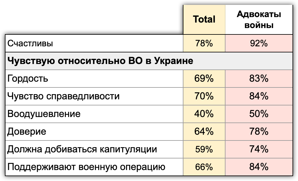 А вот «адвокатам войны», похоже, военная операция нравится. Они ее поддерживают во всех формулировках вопроса. Их не страшат санкции: почти 60% считают, что санкции не могут ни на что повлиять. Все позитивные чувства относительно этого события: гордость, воодушевление, чувство справедливости — выражены у них существенно больше.