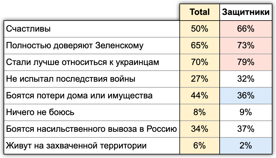 Они тоже более «счастливые», чем жители Украины в целом. Они больше доверяют Зеленскому, а президентский рейтинг достигает 82%. Стоит отметить разницу причинно-следственной связи: россияне поддержали военную операцию, потому что это решение Путина. «Защитники» поддерживают Зеленского за то, что он встал на защиту Украины, но они даже сегодня критикуют его, когда видят его ошибки.