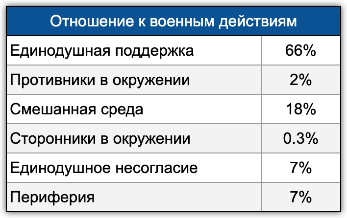 Здесь важно понимать, что к доле «ястребов» относится не «реальное» число сторонников вторжения, а лишь его наиболее последовательная, готовая идти до конца фракция. Входящие в нее люди четко понимают цели, которые перед собой ставит руководство страны, и поддерживают их. Есть другая, огромная часть населения, которая, возможно и знает об истинных целях России в Украине, но пока не готова их разделить, поддерживая лишь официально заявленные цели.
