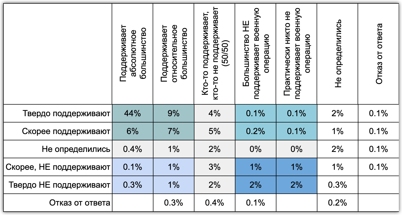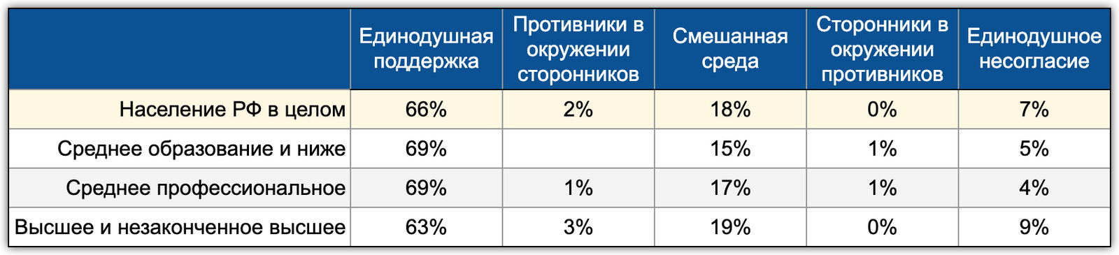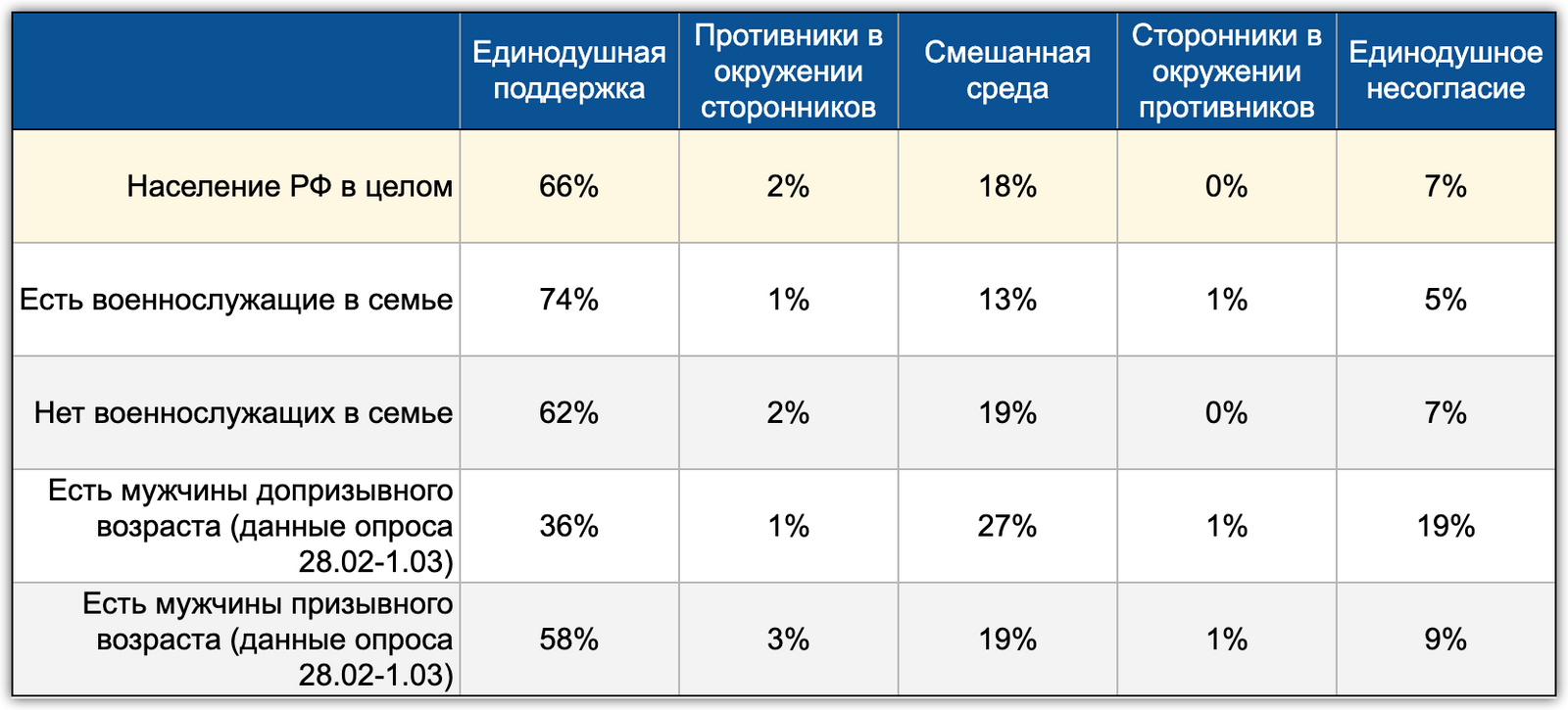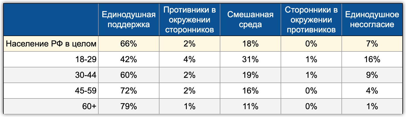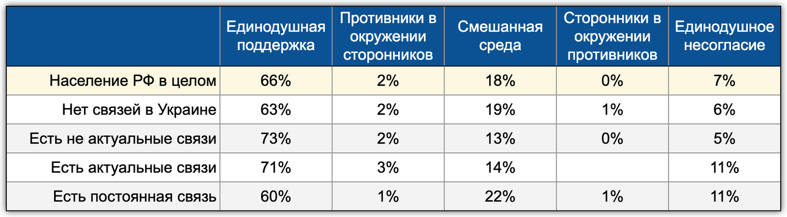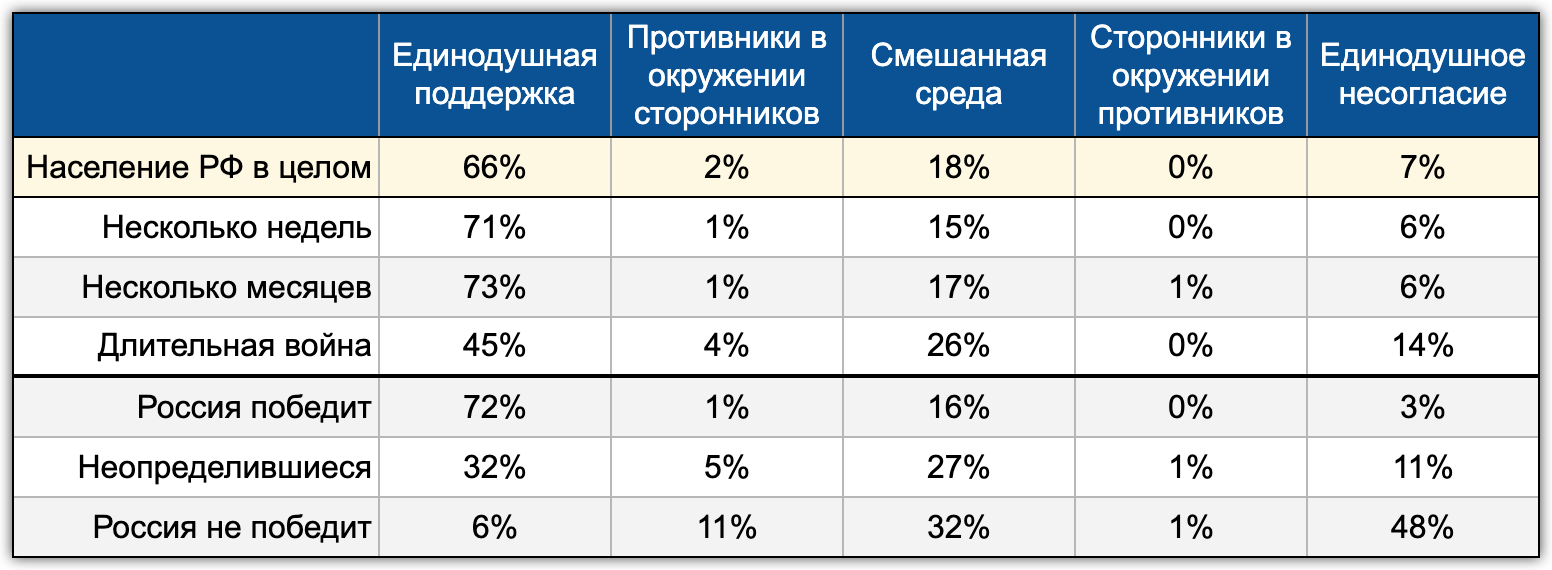 В самом начале вторжения 47% россиян поддерживали его лично и одновременно были уверены, что внутри их ближайшего круга большинство придерживаются той же точки зрения. 14% жителей страны сами были против вторжения и полагали, что их ближайшее окружение с ними солидарно. Почти каждый восьмой (12%) либо сам не имел определенной точки зрения, либо находился в окружении обладателей различных точек зрения на ситуацию в Украине.