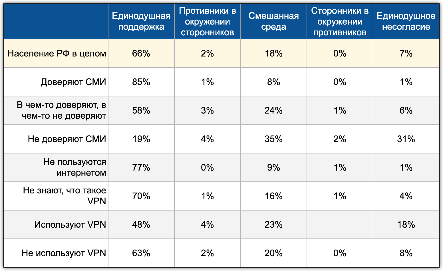 Однако неверно понимать это как чистую победу госСМИ. Во многом достигнутый успех стал возможен благодаря закрытию целого ряда негосударственных СМИ. И те россияне, кто недоволен нынешней политикой, утоляет свой информационный голод, обходя воздвигнутые государством ограничения в интернете с помощью VPN. Больше всего сторонников войны, пребывающих в окружении единомышленников, среди тех, кто интернетом не пользуется. Меньше всего таковых среди пользователей VPN. Они же чаще всего единодушно возражают против военных действий.