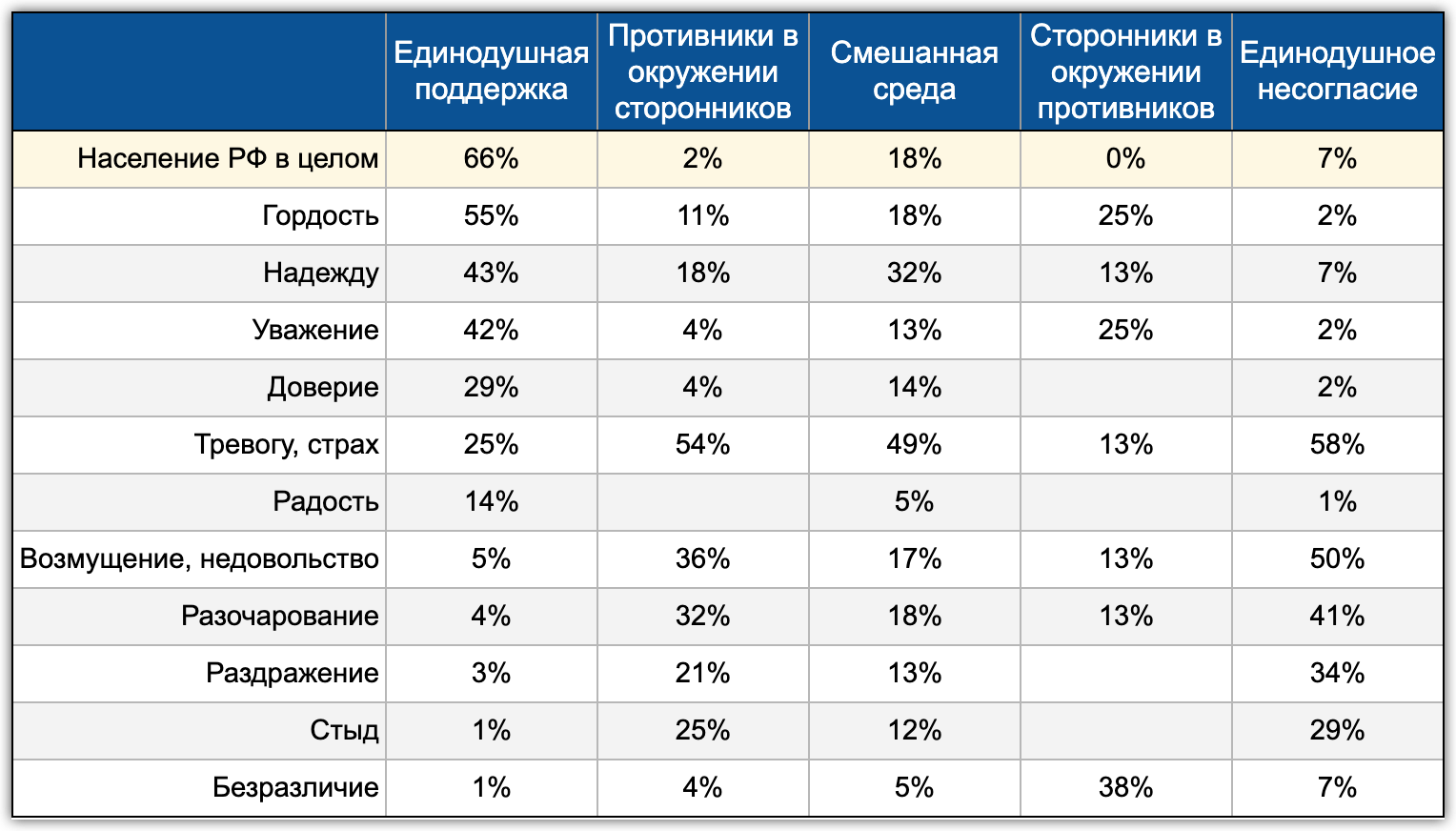 Личная и социальная поддержка/не поддержка военной операции формирует противоположные диапазоны эмоций. Для ее сторонников характерны гордость, надежда и уважение, для противников — тревога, возмущение, разочарование.