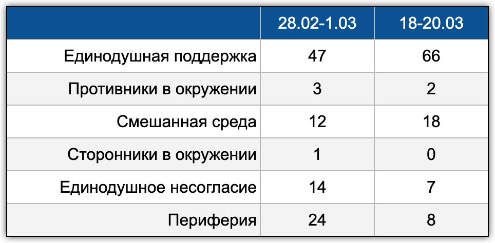 Через три недели боев, как военных, так и информационных, баланс сил изменился. Доля сторонников операции, пребывающих в поддерживающем их позицию окружении, выросла с 47 до 66%, а доля противников военных действий, живущих в окружении солидарных с ними людей, сократилась вдвое — с 14 до 7%. А вот доля находящихся на линии информационного фронта сократилась с 36 до 18%.